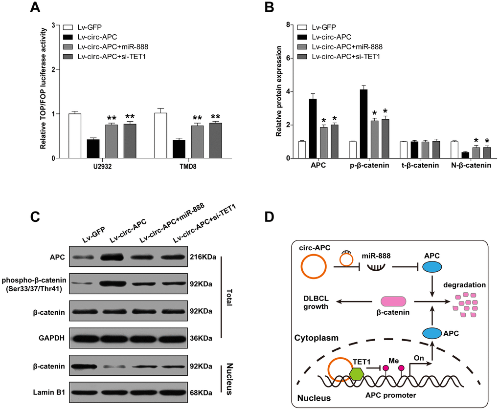 APC is a key inhibitor of the canonical Wnt/β-catenin pathway, and can increase the phosphorylation and subsequent proteolytic degradation of β-catenin, thus reducing its nuclear accumulation [16]. Therefore, we reasoned that circ-APC might counteract canonical Wnt/β-catenin signaling by elevating APC in DLBCL. To test this hypothesis, we performed a TOPFlash/FOPFlash reporter assay with wild-type and mutant TCF-4 consensus binding sites. As shown in Figure 6A, exogenous circ-APC expression dramatically reduced TOP/FOP transcriptional activity, but miR-888 overexpression or APC knockdown significantly prevented this repression. Circ-APC overexpression also markedly increased the expression of APC and the phosphorylation of β-catenin, but reduced the expression of nuclear β-catenin and well-known downstream targets of the Wnt/β-catenin pathway (c-MYC, cyclin D1, c-JUN, FGF4 and PPARD) (Figure 6B, 6C, Supplementary Figure 3). Exogenous expression of miR-888 or silencing of APC abrogated the above effects (Figure 6B, 6C). These results indicated that cytoplasmic and nuclear circ-APC can respectively bind to miR-888 and TET1 to co-upregulate APC expression, ultimately inactivating the oncogenic Wnt/β-catenin signaling pathway in DLBCL (Figure 6D).