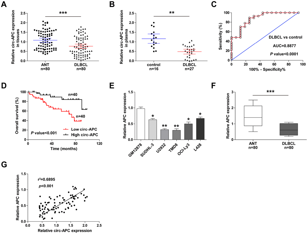 To determine the clinical applicability of circ-APC, we collected an additional 55 pairs of DLBCL and adjacent normal tissues for qRT-PCR analysis (a total of 80 pairs). Circ-APC expression was lower in DLBCL tissues than in normal tissues (Figure 7A). We also performed qRT-PCR to analyze circ-APC levels in plasma samples from 27 DLBCL patients and 16 healthy controls, and found that plasma circ-APC levels were significantly lower in DLBCL patients (Figure 7B). A receiver operating characteristic curve was used to assess the diagnostic utility of plasma circ-APC levels in DLBCL. As shown in Figure 7C, the area under the curve was 0.8877 (95% confidence interval = 0.8012-0.9651; p < 0.0001), suggesting that plasma circ-APC can excellently distinguish DLBCL patients from healthy controls.
