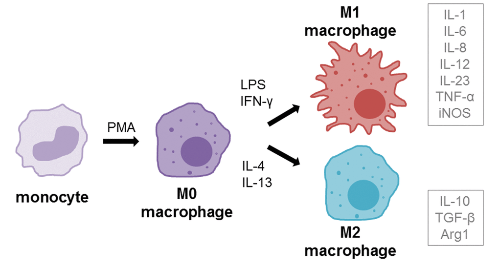 THP-1 cells (2 x 106 cells, if not stated otherwise) were differentiated into macrophages using 100 ng/mL PMA & 50 µM β-ME diluted in normal growth medium (further stated as differentiation medium) for 48 h. Differentiated macrophages (M0) can be further polarized via incubation for 24 h with 100 ng/mL LPS and 20 ng/mL rh IFN-γ for M1 phenotype or with 20 ng/mL rh IL-4 and rh IL-13 for M2 phenotype (according to [59–61]) (Figure 1).