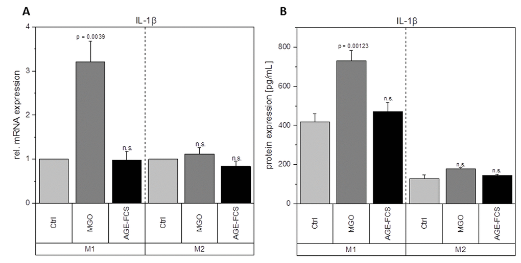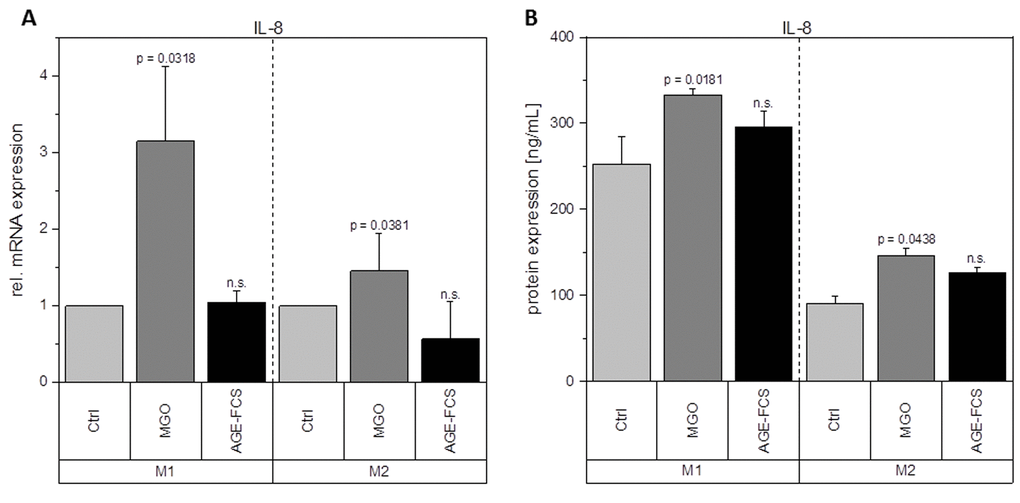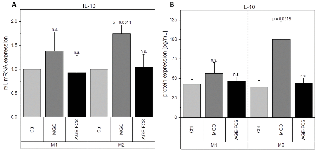 Macrophages are key players during inflammation. Therefore, we analyzed expression of inflammation-related cytokines in M1 and M2 macrophages after glycation with 1 mM MGO or treatment with 10% AGE-FCS. Figure 7A shows relative mRNA levels for pro-inflammatory cytokine IL-1β. M1 macrophages showed a significant increase of IL-1β mRNA after treatment with MGO, however, there was no change after treatment with AGE-FCS. For M2 macrophages we could also not detect any changes in mRNA levels, both for MGO and AGE-FCS treatment. We could also confirm these findings on protein levels (Figure 7B) in the supernatant. Due to this increase of IL-1β in M1 macrophages, we wanted to elucidate whether the inflammasome is involved. We checked for caspase-1 expression using immunoblotting after 4, 8 and 24 h in M1 and M2 macrophages treated with MGO or AGE-FCS. However, we could not detect any upregulation of caspase-1 compared to the untreated controls in any of the treatments. Regarding expression of pro-inflammatory cytokine IL-8, we could show an increase of mRNA expression levels (Figure 8A) after treatment with MGO for both M1 and M2 macrophages, while treatment with AGE-FCS did not have any effect. We could also confirm these findings on protein levels (Figure 8B) in the supernatant. We also analyzed TNF-α as a multifactorial cytokine involved in inflammation and could show an increase of mRNA expression levels for both M1 and M2 macrophages treated with MGO (Figure 9A). Treatment with AGE-FCS did not lead to any changes on expression of TNF-α. These findings could be confirmed on protein levels (Figure 9B). Regarding anti-inflammatory cytokine IL-10, we measured an increase in mRNA levels (Figure 10A) of M2 macrophages treated with MGO, while all other samples remained unaffected. Again, this increase could be confirmed on protein levels (Figure 10B).