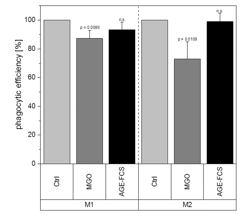 Elevated MGO levels could already be detected in murine macrophages after infection with mycobacteria, affecting activation, immunity and apoptosis [38]. Also, it has been demonstrated that MGO treatment induces activation of murine macrophages and ROS production in Sarcoma-180 bearing tumor mice [39,40], and therefore can even be beneficial for the immune system as immunomodulation against tumors. In recent studies, we could demonstrate that MGO treatment had a negative effect on the activation of human natural killer cells [41]. In the present study, we used MGO as a glycating agent and analyzed inflammatory and functional properties of human macrophages after glycation, in comparison to treatment with AGE-modified serum proteins. We could show that glycation modulated cytokine expression and also altered phagocytic efficiency of macrophages, while treatment with soluble AGEs had no effects.