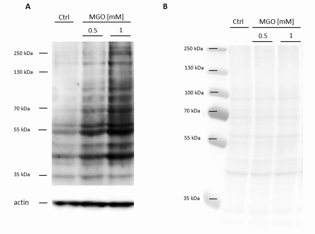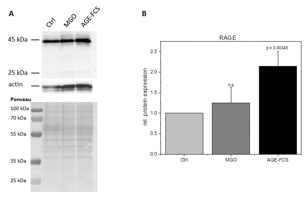 FCS with or without addition of 1 mM MGO was incubated at 37 °C for 24 h. FCS was stored at -20 °C until use. Glycated FCS is further stated to as AGE-FCS. Glycation of AGE-FCS was confirmed via dot blot with anti-AGE antibody CML-26 (Abcam, Cambridge, UK) at a concentration of 0.05 µg/mL. We could demonstrate that our AGE-FCS is strongly glycated and the untreated FCS is not (Supplementary Figure 4).