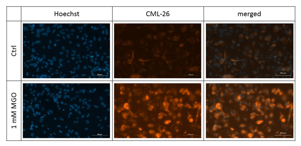 Glycation and the accumulation of so called advanced glycation end products (AGEs) have been known to occur during normal aging [1] but also in the progression of several diseases, such as diabetes [2,3], Alzheimer’s disease [4,5], multiple sclerosis [6], and atherosclerosis [7]. Glycation is the non-enzymatic reaction of the carbonyl group of a reducing sugar (e.g. glucose or fructose) with a free amino group of a protein, forming a non-stable Schiff base [8]. Further rearrangement leads to formation of a more stable ketosamine, the so-called Amadori product. Irreversible modification of this Amadori product finally results in the formation of AGEs. In addition to sugars, highly reactive dicarbonyl compounds, such as methylglyoxal (MGO) or glyoxal, can also form AGEs [9]. MGO is a naturally occurring byproduct of glycolysis. Up to 0.4% of glucose molecules per cycle are metabolized to MGO [10,11]. During progression of several diseases as well as during aging, MGO concentrations are elevated [12]. AGEs can be recognized by several receptors on the cell surface. One of the best known is the receptor for advanced glycation end products (RAGE), a member of the immunoglobulin superfamily and a class J scavenger receptor [13,14]. Binding of AGEs to RAGE leads to cellular activation and internalization of the bound AGE structures [15], resulting in production of reactive oxygen species (ROS), induction of p44/p42 mitogen activated protein kinase and nuclear transcription factor κB (NF-κB) [16]. Homeostasis is maintained between produced and incorporated AGEs and their cleavage. However, this process can be altered for example by permanently higher blood glucose levels, that in turn lead to higher levels of AGEs [17]. With increasing age of the population, cardiovascular and metabolic diseases and impairments related to accumulation of AGEs are rising [18,19], as well as the incidence of type II diabetes [20,21]. Regarding diabetes, it has been shown that the plasma concentrations of MGO are increased two- to fivefold compared to healthy individuals [22], indicating increased formation of AGEs [23]. It is also known that 4 - 10% of diabetic patients develop foot ulcers [24,25], resulting in infected wounds that display a chronic, pro-inflammatory phenotype [26], as well as impaired and delayed wound healing [27,28]. However, the underlying mechanisms of impaired wound healing in both diabetic and elder patients remain unknown and effective treatments are proving elusive.