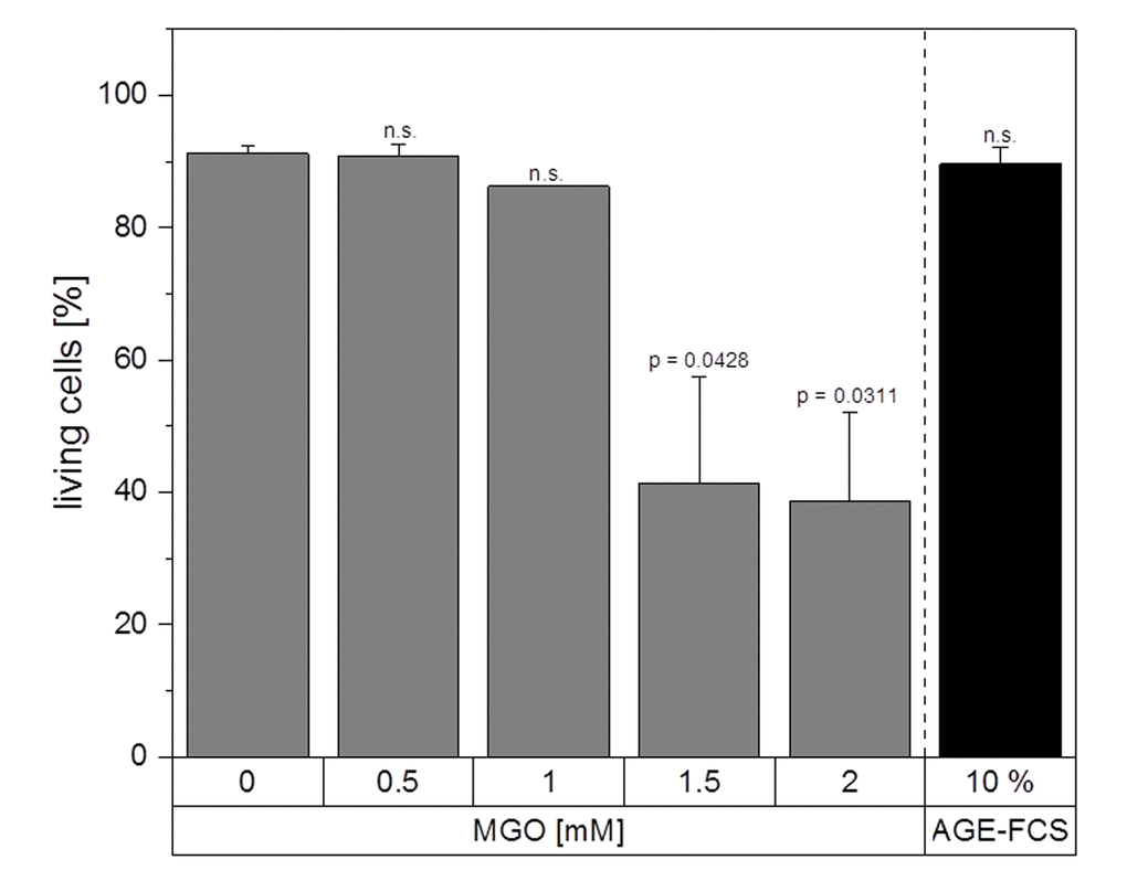 Glycation and accumulation of AGEs are known to have negative effects on protein function and maintenance of cellular homeostasis. During the process of ageing, there is a decline in immune functions and immune responses, resulting in health implications and immune deficiency [42,43]. Although it is known that AGEs are responsible for several age-related diseases, there is still not much known about their impact on the immune system in general. In this study, we could show that MGO treatment led to an increase in cellular formation of AGEs in macrophages and the level of AGE correlated with the MGO concentrations used. MGO concentrations up to 1 mM did not lead to significant decreases in metabolic activity of macrophages. Reduced metabolic activity and induction of apoptosis could only be detected after incubation with 1.5 or 2 mM MGO. In other cell lines, e.g. murine alveolar macrophages, even lower concentrations of MGO (0.4 and 0.8 mM) were able to induce apoptosis and necrosis [38]. The used MGO concentrations in this study also did not induce cellular production of ROS in macrophages. Contrary, in peritoneal macrophages of tumor mice an induction of superoxide anion and nitrite production as well as ROS levels could be observed after MGO treatment [39]. In general, phagocytes can produce high levels of ROS and reactive carbonyl species upon exposure to MGO, leading to inflammation, apoptosis and necrosis, as well as release of several cytokines [62]. Our data indicates that the effects we observed are not only based on higher ROS levels and oxygen stress.