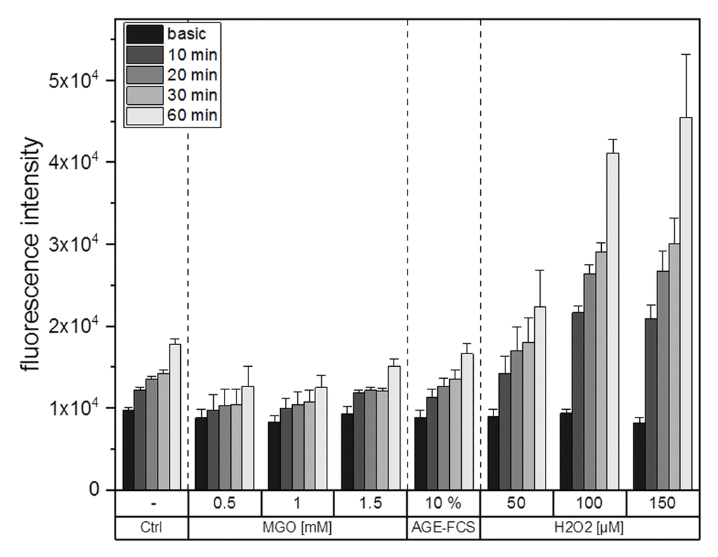 It is well known that glycation and AGE-signaling can increase cellular ROS levels. To clarify whether glycation using MGO or the treatment with AGE-FCS induce production of cellular ROS, we performed ROS measurements using an H2DCFDA assay. Figure 6 shows one representative graph for ROS measurements. The values which are entitled “basic” represent the fluorescence signal of the samples after loading with H2DCFDA but without any treatments. Increasing concentrations of H2O2 were used as positive controls for ROS induction. We could show that treatment with 0.5, 1 or 1.5 mM MGO as well as 10% AGE-FCS did not increase ROS production compared to the control. However, treatment with H2O2 did raise cellular ROS levels in a time and concentration dependent manner.