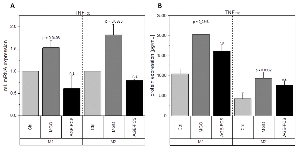 Glycation upregulates mRNA expression of pro-inflammatory cytokine IL-1β in M1 macrophages and TNF-α and IL-8 in both M1 and M2 macrophages. It also enhances the mRNA and protein expression levels of anti-inflammatory cytokine IL-10 in M2 macrophages. This could also be verified on protein levels. Although treatment with AGE-FCS increases the expression of RAGE, there was no effect on these mRNA or protein expression levels. We aimed to exclude that our findings are influenced by glycated serum proteins in the cell culture medium. Therefore, we always used medium containing 10% AGE-FCS as a control, that was glycated under the same conditions as we glycated the cells, in order to verify that our results are linked to direct glycation of the macrophages.