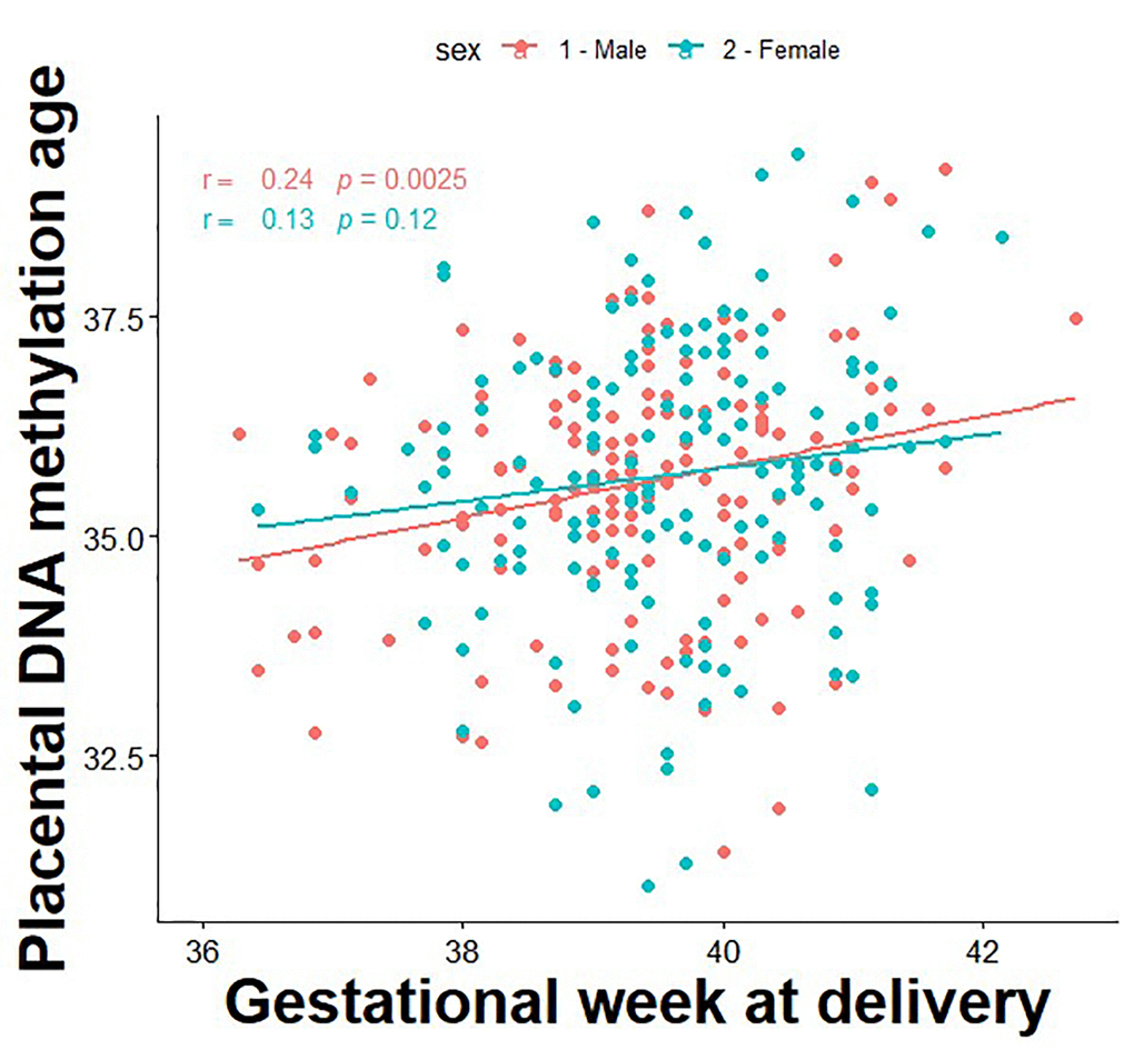 In summary, this study found associations between epigenetic aging of term placenta and fetal growth throughout pregnancy. Notably, placental epigenetic age acceleration was found to be associated with fetal growth in a sex-dependent manner, showing stronger fetal and neonatal size-lowering effect among male than female fetuses. This finding recommends future studies to investigate placental function in relation to fetal outcomes stratified by fetal sex. Future studies are needed to test the potential for using non-invasive maternal samples during pregnancy for predicting placental epigenetic aging, so that the prognostic and diagnostic use of the placental clock may be realized in clinical practice. Together with ongoing efforts that aim to uncover the mechanisms of epigenetic aging [64], this study helps advance our understanding of the biological underpinnings of sex differences in aberrant fetal growth and the early programming of adult diseases.