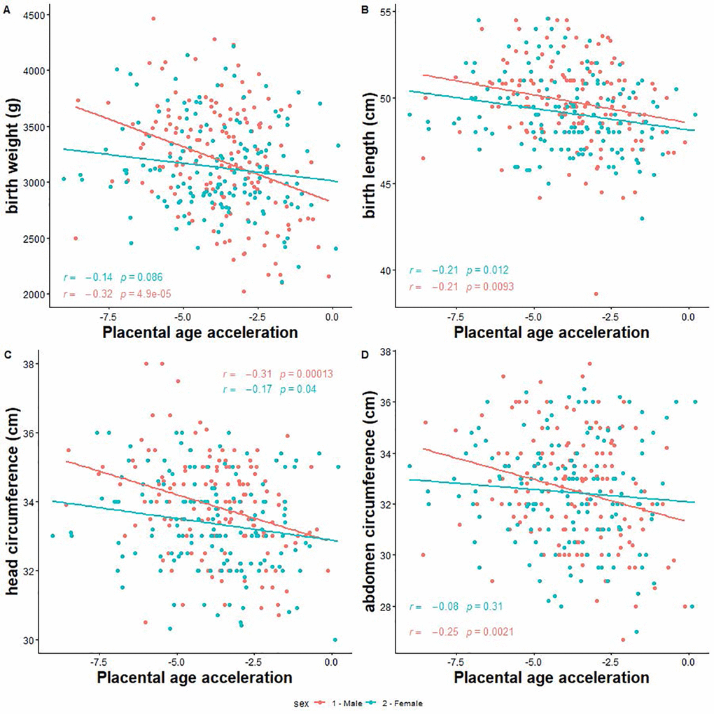 Emerging data suggest that the epigenetic aging rate may be largely determined in early pregnancy. For example, twin studies reported considerably high heritability (57%) of epigenetic age acceleration in the placenta [41] as well as other tissues [35,36]. In addition, the rate of epigenetic aging has been found to be developmentally adjusted [36,43] and remains stable across the lifespan [44]. In the present study, we investigated sex-specific associations of PAA with fetal growth, neonatal anthropometry measures, and risk of low birth weight in a cohort of pregnant women in the U.S. with high quality longitudinal fetal sonography data. Specifically, we tested associations of PAA with: 1) longitudinal trajectories of fetal growth measures (i.e., fetal weight, head circumference, biparietal diameter, abdominal circumference, humeral length, and femur length) across 13-40 weeks gestation; 2) fetal growth measures at each gestation week; 3) neonatal anthropometry (birth weight, birth length, head circumference, and abdominal circumference); and 4) risk of low birth weight (birthweight less than 2500 g) and small-for-gestational age (SGA: birthweight less than the 10th percentile for gestation age) at birth.