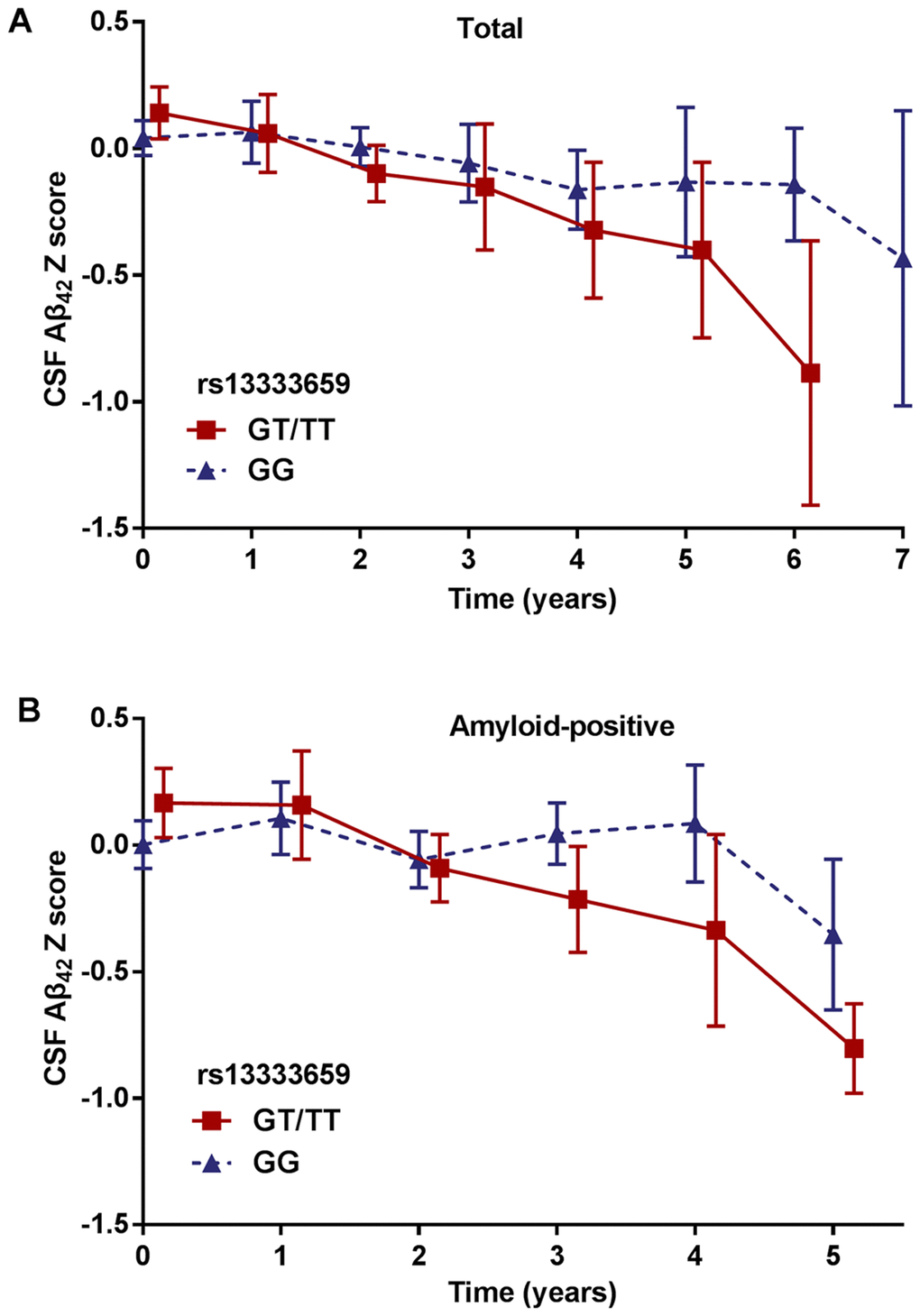 Cerebrospinal fluid was acquired by lumbar puncture and stored at −80°C in the ADNI Biomarker Core laboratory at the University of Pennsylvania Medical Center. CSF Aβ42 was measured using the xMAP Luminex platform and Innogenetics/Fujirebio AlzBio3 immunoassay kits. Additional information can be found at http://adni.loni.usc.edu/methods/biomarker-analysis. Longitudinal CSF Aβ42 information was collected in this GWAS with at least one year follow-up measurements. The annualized percent changes in CSF Aβ42 were based on the measurements in each follow-up. The annualized percent changes in CSF Aβ42 were calculated as follows:
