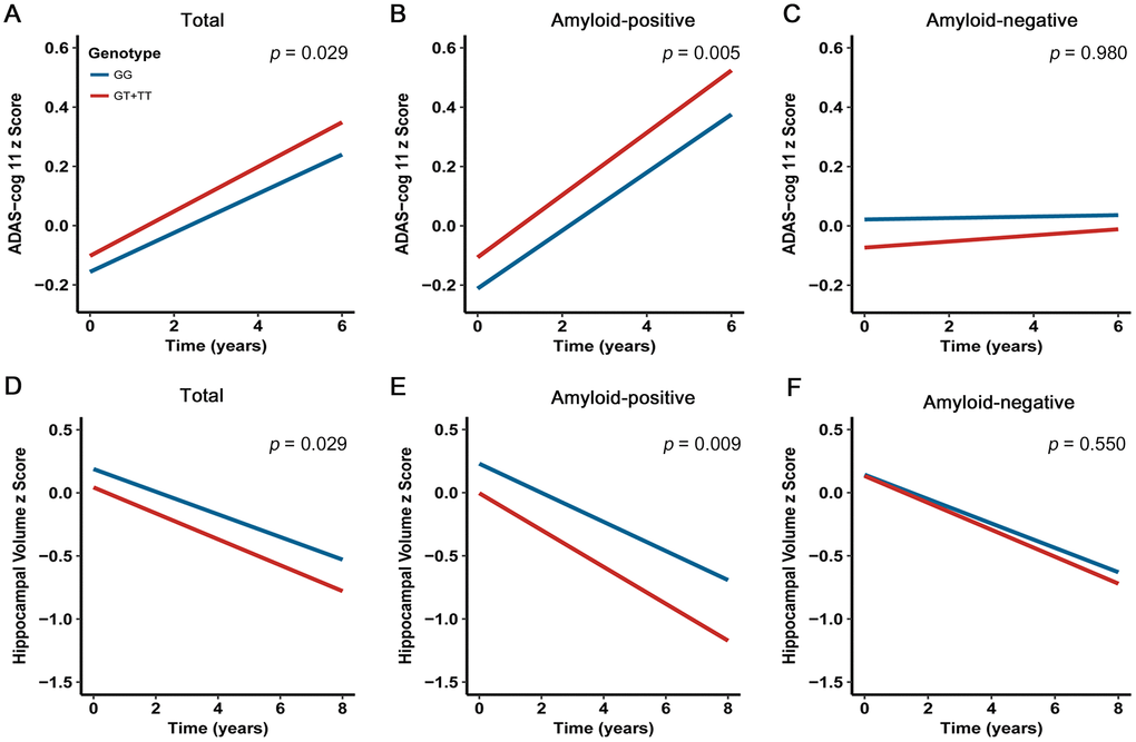 The emerging amyloid pathology has been demonstrated to result in atrophy rates of brain structures during the development of AD [22–24]. We hypothesized that rs13333659-T carriers in CBFA2T3 would show faster rates of atrophy in AD-related brain regions (such as the hippocampus region). In order to assess the relationship between rs13333659 variants and hippocampal atrophy over time, we examined longitudinal changes of hippocampal volume over 8 years using linear mixed models. Five hundred and eighty-six non-demented elders (MCI = 361, CN = 225) with structural MRI data from ADNI were examined in this longitudinal analysis. Our analyses were conducted when genotype, age, gender, education level, disease status, APOE ε4 genotype, follow-up duration and intracranial volume were included as covariates. The results revealed that rs13333659-T carriers have increased hippocampal atrophy rates compared to non-carriers across all subjects (p = 0.029, β= −0.160, n = 586; Figure 3D). In particular, the higher rate of hippocampal atrophy was observed in baseline amyloid-positive group (p = 0.009, β = −0.285, n = 260; Figure 3E), while no significant differences were observed between rs13333659-T carriers and non-carriers in baseline amyloid-negative group (p = 0.550, β = −0.083, n = 207; Figure 3F).