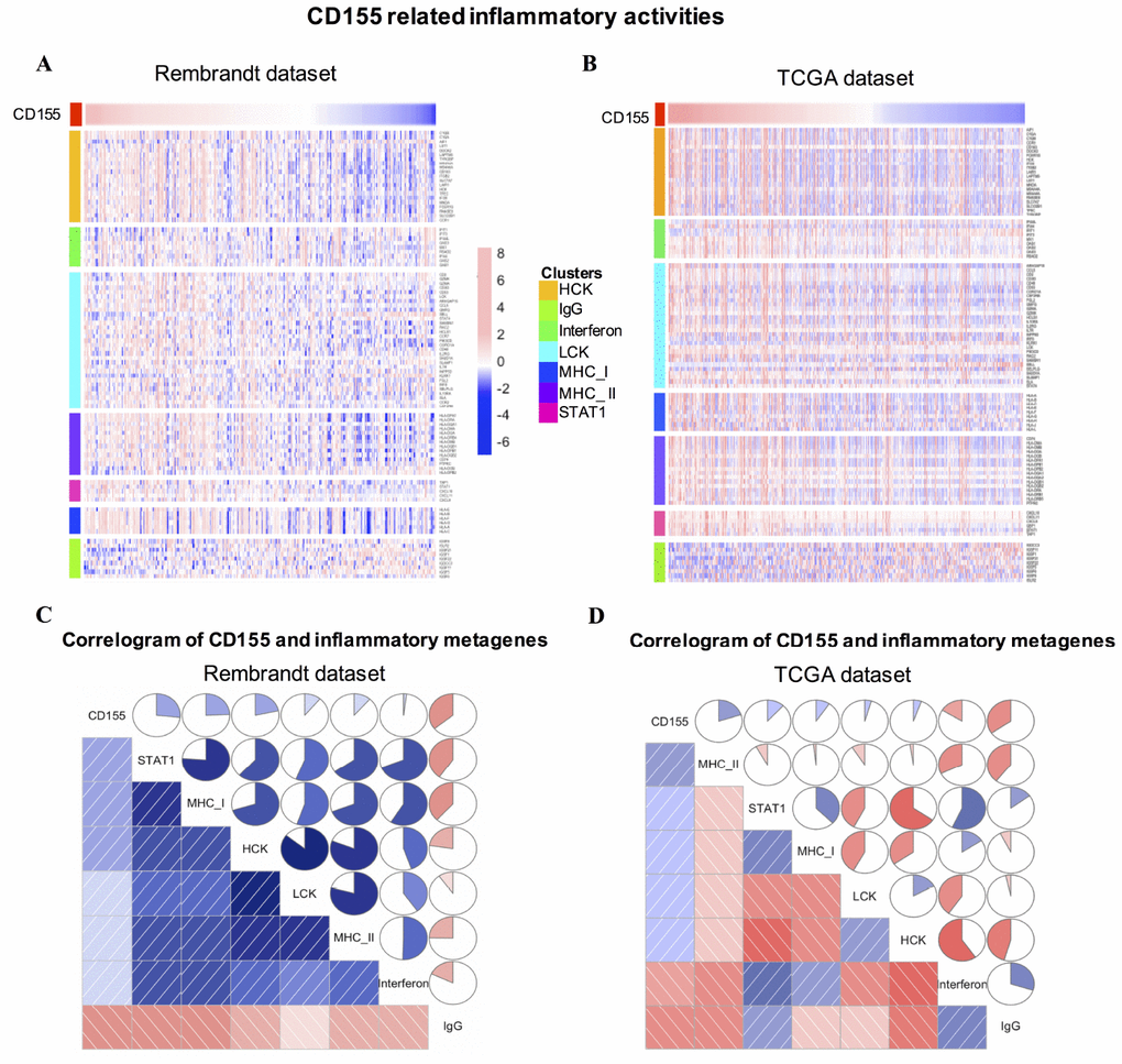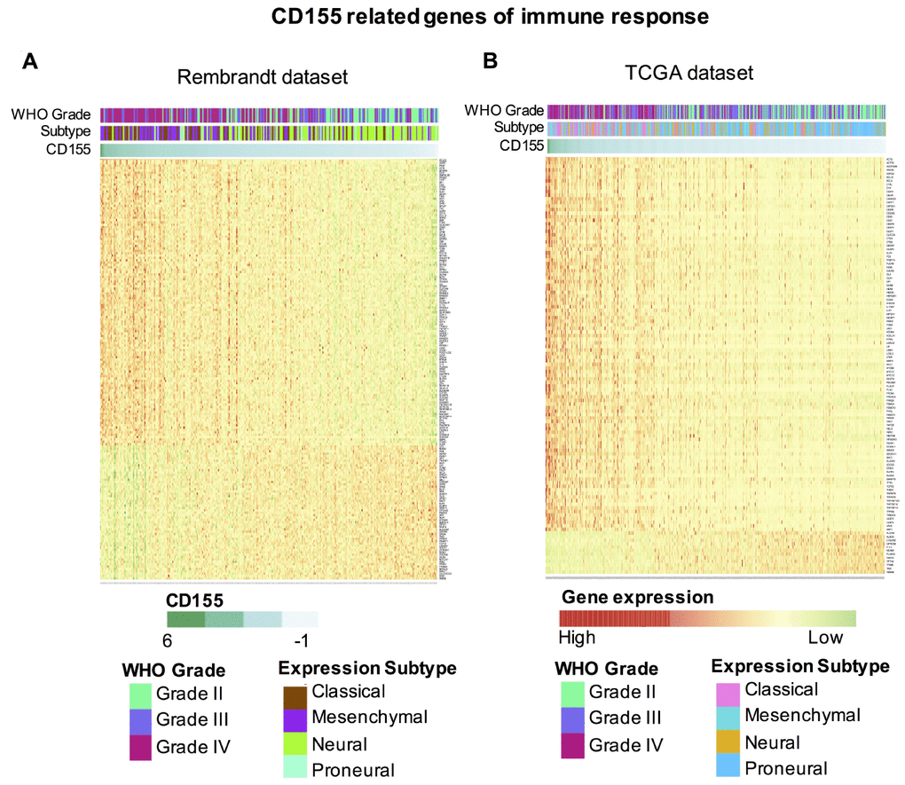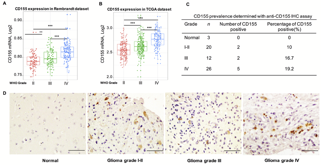 As a promising target for immunotherapy, the relationship between CD155 expression and immune-related markers, cells and receptors in glioma is largely unknown. Previous studies found CD155 is up-regulated in HGG cases and in primary cell lines derived from these tumors [12, 14]. And it has been investigated as a poliovirus receptor for therapeutic intervention with oncolytic poliovirus recombinants in recurrent glioblastoma (GBM) [1]. However, comprehensive reports of CD155 expression in all gliomas are lacking so far. Therefore, we analyzed the protein level of CD155 in human glioma samples, the clinical and molecular data of 474 glioma samples from REpository for Molecular BRAin Neoplasia DaTa (Rembrandt) dataset to investigate CD155 expression, as well as its relationship with immune related molecules in glioma. To overcome the limitations of individual studies, we validated our findings using 699 glioma samples from The Cancer Genome Atlas (TCGA) dataset. Collectively, these findings would give us a better understanding of CD155 in glioma, and provide molecular basis for the development of CD155-targeted cancer immunotherapies.