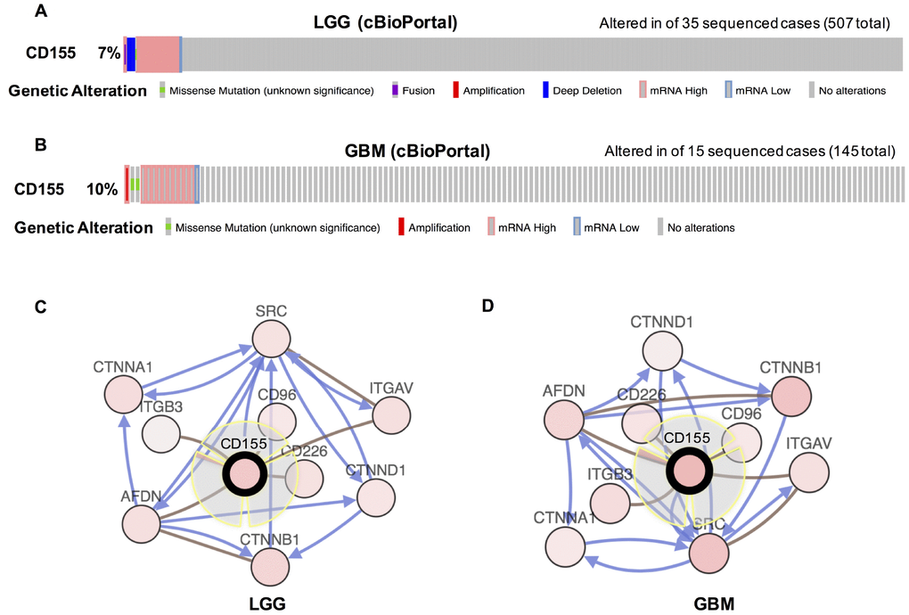 We then evaluated the types and frequency of CD155 alterations in gliomas based on sequencing data from glioma patients in the TCGA dataset. CD155 was altered in 35 of 570 (7%) low grade glioma patients (Figure 2A). These alterations were mRNA upregulation in 26 cases, deep deletion in 6 cases, mRNA downregulation in 2 cases, and mutation in 1 case. CD155 was altered in 14 of 145 (10%) GBM patients (Figure 2B). These alterations were mRNA upregulation in 10 cases, mutation in 2 cases, amplification in 1 case, and mRNA downregulation in 1 case. Thus, mRNA upregulation is the most common type of CD155 gene alterations in glioma. We also used cBioPortal (https://www.cbioportal.org) to see the biological interaction network of CD155 in gliomas. CD155 can form the same complex with CD96, CD226, AFDN, ITGAV, ITGB3, and AFDN in low-grade glioma (LGG) (Figure 2C) and GBM samples (Figure 2D) derived from the Biological Pathway Ex-change (BioPAX).