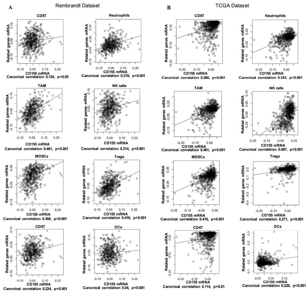 Tumor-infiltrating immune cells play a key role in tumor development and control. In glioma, these immune cells can be important effector cells in inflammation and immune responses. Thus, we examined the correlation of CD155 expression with immune cell-specific marker genes to evaluate the relationship between CD155 expression and immune cells. Six immune cells frequently infiltrating tumors were selected, including CD8+ T cells, CD4+ T cells, neutrophils, tumor-associated macrophages (TAMs), natural killer (NK) cells, myeloid-derived suppressor cells (MDSCs), Dendritic cells (DCs), and regulatory T cells (Tregs). The detailed information of immune cell-specific marker genes has been listed in Supplementary Table 3. As shown by Canonical correlation analyses, glioma-derived CD155 expression was positively correlated with biomarker gene expression of all six immune cell types in both the Rembrandt and TCGA datasets (Figure 5A, 5B). We also performed immunohistochemical staining of immune cell-specific markers including CD11b, CD14, CD56, CD11c, FOXP3, CD8 and CD4 in glioma tissues. Higher expression levels of these markers can be detected in CD155-positive glioma samples compared with CD155-negative ones (Supplementary Figure 2). These results suggested that high CD155 expression in gliomas tend to have more infiltrating immune cells compared with gliomas with low CD155 expression.