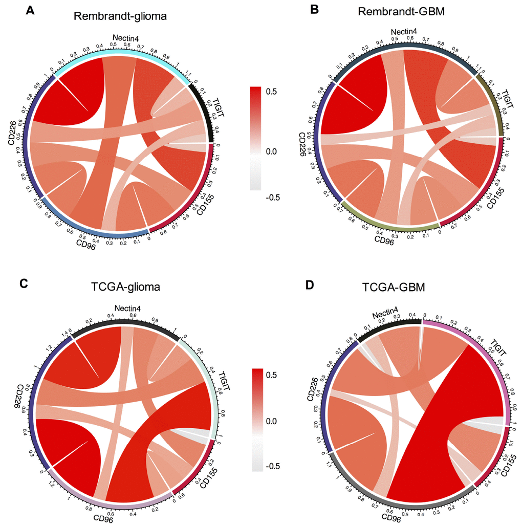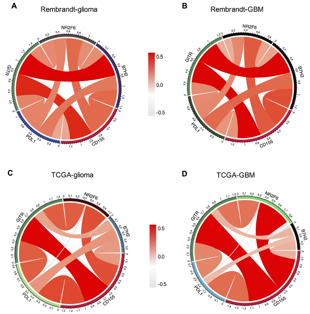 Recent study has demonstrated the enhanced antitumor effect of contemporary immune checkpoints in CD155–/– mice, suggesting the potential clinical combination of these immune checkpoints blockade and CD155 inhibition [8]. Thus, we analyzed the relationship between CD155 and other immune checkpoint markers that have been examined in clinical trials or clinical situations. Pearson correlation analysis was performed using both Rembrandt and TCGA datasets. After screening several immune chekpoints including PD-1, PD-L1, PD-L2, CTLA-4, TIM-3, B7-H2, NR2F6 and GITR, we found that CD155 was positively associated with PD-L1, B7-H2, NR2F6 and GITR as shown by Circos plots. Similar results were found in all grades glioma and GBM samples in Rembrandt and TCGA datasets (Figure 6), indicating the possible synergistic effects of CD155 with these checkpoint members.