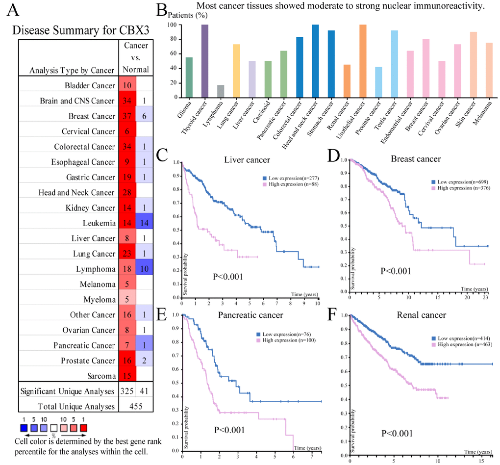 CBX3/HP1γ mRNA expression levels were examined in various cancers using the Oncomine (Figure 1A) and Human Protein Atlas (Figure 1B) databases. Most cancer tissues showed moderate to strong nuclear expression of CBX3/HP1γ. However, most lymphomas, prostate, and renal cancers displayed weak or negative staining. Bioinformatic analysis indicated that upregulated CBX3/HP1γ expression predicts poor prognosis in liver cancer (Figure 1C), breast cancer (Figure 1D), pancreatic cancer (Figure 1E), and renal cancer (Figure 1F) (Kaplan-Meier plot, log-rank test, all P values< 0.001).