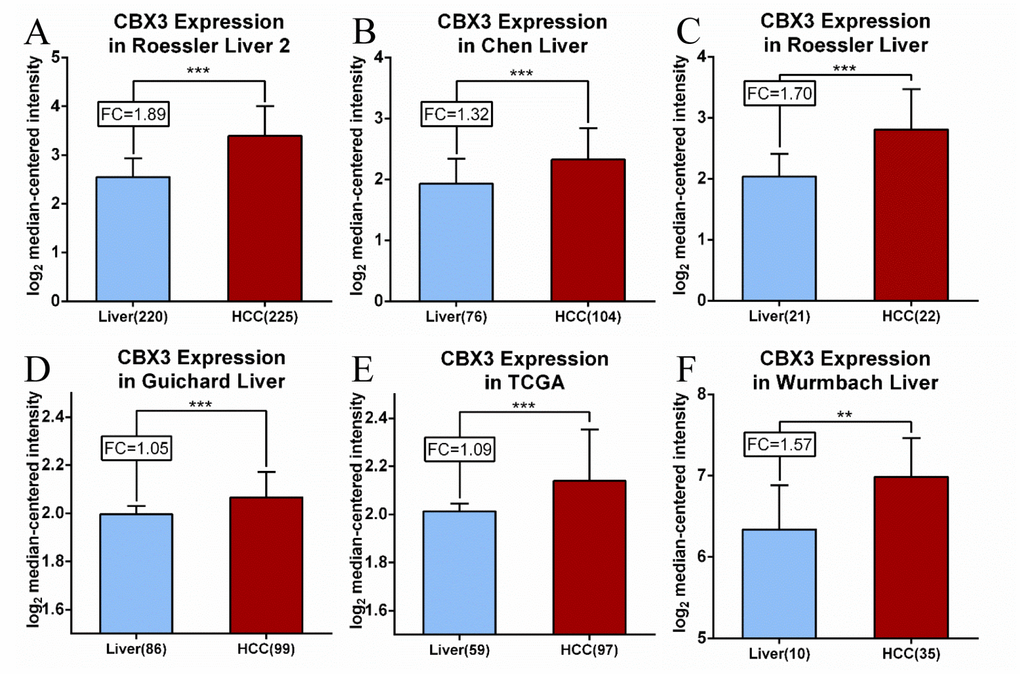 CBX3/HP1γ expression was compared in liver cancer and normal liver tissues in the following six datasets from the Oncomine and TCGA databases (Figure 2): Roessler Liver 2, Chen Liver, Roessler Liver, Guichard Liver, TCGA, and Wurmbach Liver. CBX3/HP1γ mRNA expression was elevated in liver cancer tissues compared to normal tissues. In the two Roessler datasets, CBX3/ HP1γ mRNA expression was 1.89-fold (p=7.91E-63) and 1.70-fold (p=2.12E-5) higher in HCC tissues [34]. Similarly, in the Chen Liver [35], Guichard Liver [36], Wurmbach Liver [36], and TCGA datasets, CBX3/HP1γ mRNA expression was increased 1.32- (p=1.85E-8), 1.05- (p=2.36E-9), 1.48- (p=6.23E-8), and 1.09-fold (p=3.93E-8), respectively, in HCC tissues.