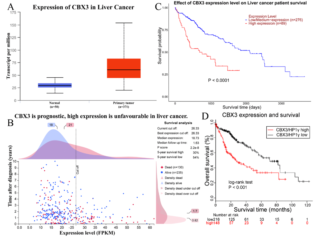 In summary, our bioinformatics analysis indicates that elevated Cbx3/HP1γ expression is associated with poor survival in various malignancies. Our results further suggest that high CBX3/HP1γ expression in HCC tumor cells is an independent prognostic factor associated with poorer disease outcomes in HCC patients, and that CBX3/ HP1γ plays an important role in HCC tumorigenesis and progression by promoting cell proliferation.