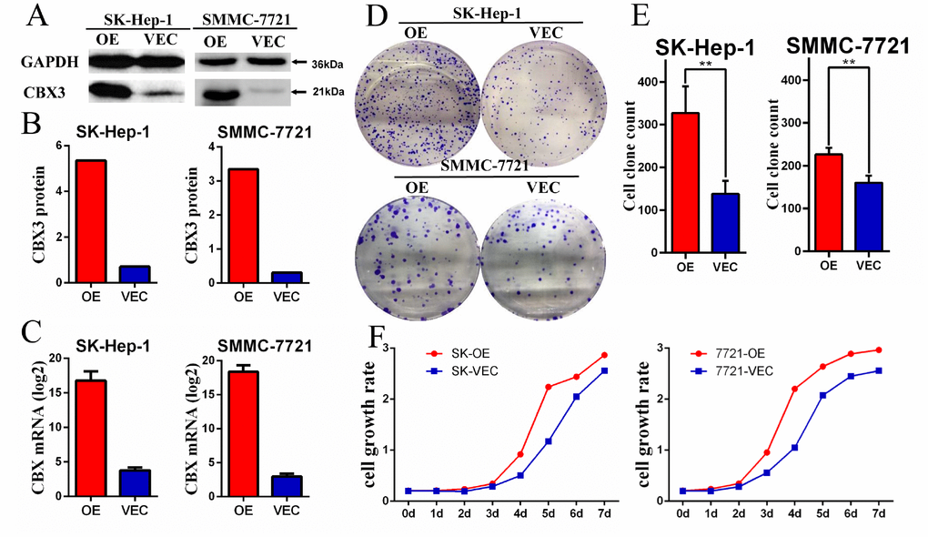 Because higher CBX3/HP1γ expression was associated with malignant clinicopathological features in HCC patients, we explored the potential biological function of CBX3/HP1γ in HCC tumorigenesis. The HCC cell lines SK-Hep-1 and SMMC-7721 were stably transfected with a CBX3/HP1γ expression plasmid (pEZ-Lv105-CBX3) or a control vector (pEZ-Lv105). Ectopic CBX3/HP1γ messenger RNA and protein expression in transfected cells was confirmed by quantitative real-time PCR and Western blot analyses, respectively (Figure 5A–5C). Functional CCK-8 and colony-forming assays were used to characterize proliferation ability in cells overexpressing CBX3/HP1γ. As shown in Figure 5D and 5E, cells overexpressing CBX3/HP1γ generated significantly more colonies than cells expressing only the vector in both the CCK-8 and colony-forming assays.
