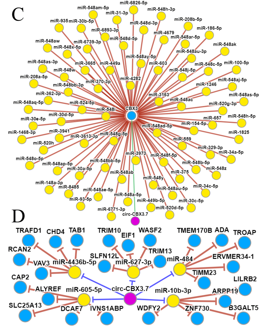 (C and D) Upstream circRNA and microRNA of CBX3/HP1γ from the CircNet database.