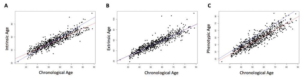 Three measures of DNA methylation age were calculated. Intrinsic age was calculated as the linear combination of the beta values of 353 CpGs that have been previously shown to predict chronological age in multiple tissues by Horvath, et al. [28], times their effect size from the regression with chronological age. Extrinsic age was calculated similarly, but from 71 CpGs that have previously shown to predict chronological age in whole blood by Hannum, et. al. [29]. Phenotypic age (PhenoAge) was calculated similarly, but from 513 CpGs previously shown by Levine, et. al., to predict a measure of phenotypic age built from age, immune function measures, and metabolic measures [30]. Phenotypic age acceleration was developed by Levine, et. al. by first developing a phenotypic age measure based on ten age-related clinical characteristics (chronological age, albumin, creatinine, glucose, C-reactive protein levels, lymphocyte percentage, mean cell volume, red blood cell distribution width, alkaline phosphatase, and white blood cell count), and then using elastic net to select 513 CpGs that predict this phenotypic age. Like the extrinsic measure, phenotypic age acceleration was also designed for use in blood samples, and so both of these measures may not be well-suited for other tissues. Intrinsic age acceleration, because it was developed in multiple tissues, is independent of age-related changes in blood cell composition. For this study, intrinsic and extrinsic age were calculated from the background-corrected beta values using Horvath’s publicly available online calculator (https://dnamage.genetics.ucla.edu). PhenoAge was calculated from the published coefficients for these 513 CpGs [30]. All three measure first calculate a DNA methylation based age, and then calculate the age acceleration from the residuals of the regression of DNA methylation age on chronological age.