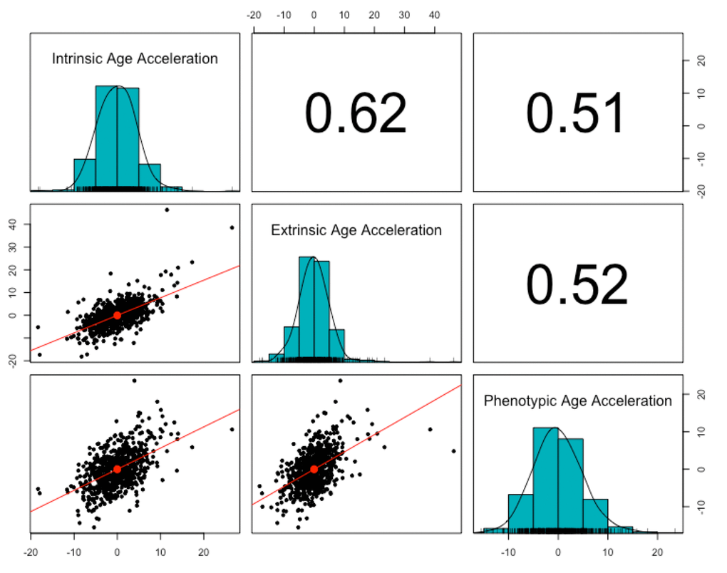 To overcome this difficulty, biomarkers of age have been developed. There is a well-established association between aging and DNA methylation [17–26]. Therefore, epigenetic clocks, developed from DNA methylation at specific sites across the genome, are becoming popular biomarkers of age [27]. Using these epigenetic clocks, methylation-based estimates of age can be predicted, and the difference between this predicted age and chronological age is defined as age acceleration. Several different measures of age acceleration have been constructed from DNA methylation data, including intrinsic age acceleration [28], extrinsic age acceleration [29], and phenotypic age acceleration [30]. Extrinsic age acceleration is based on 71 CpGs, which were selected from an elastic net regression of age in blood cells, and, therefore, is not well-suited as an estimate of age in non-blood tissues [29]. Intrinsic age acceleration is based on 353 CpGs, which were selected from an elastic net regression of age in multiple tissue types, making it more robust to age-related changes in blood composition and generalizable across most human tissues [28]. Phenotypic age acceleration uses 513 CpGs to capture information from ten age-related clinical characteristics (chronological age, albumin, creatinine, glucose, C-reactive protein levels, lymphocyte percentage, mean cell volume, red blood cell distribution width, alkaline phosphatase, and white blood cell count). Like the extrinsic measure, phenotypic age acceleration was also designed for use in blood samples [30].