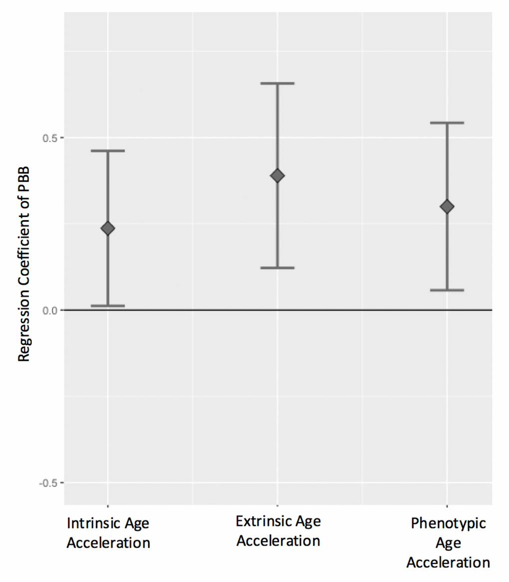 All three measures of age acceleration were positively associated with total serum PBB levels, even after controlling for sex, cell type estimates, and lipid levels, such that high age acceleration was more common in people with higher levels of PBB. For every natural log unit increase in PBB exposure, there is a 0.24 year increase in intrinsic age acceleration (β=0.24, 95% CI=0.01-0.46, p = 0.03), a 0.39 year increase in extrinsic age acceleration (β=0.39, 95% CI=0.12-0.65, p = 0.004), and a 0.30 year increase in phenotypic age acceleration (β=0.30, 95%CI=0.05-0.54, p = 0.01; Figure 3; Figure S1; Table S2). These associations were consistent if PBB-153 (the congener detected in the majority of the participants) was analyzed with each age acceleration measure (Figure S2), if total lipid level was not included in the model, or if age was included as an additional covariate (Table S2).