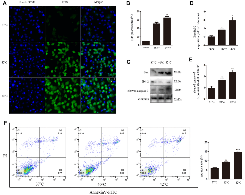 To investigate the effects of heat stress on ROS generation by GCs, DCF fluorescence was evaluated as a surrogate measure of ROS production in cultured bovine GCs. We found that ROS generation increased with increasing temperatures, i.e. 37°C < 40°C < 42°C (Figure 1A, 1B). In parallel, western blot analyses revealed apoptosis induction, denoted by upregulation of cleaved caspase-3 and increased Bax/Bcl-2 ratio (Figure 1C–1E). Furthermore, the increase in the apoptotic rate with increasing temperatures was also confirmed through Annexin V/PI staining using flow cytometry (Figure 1F).