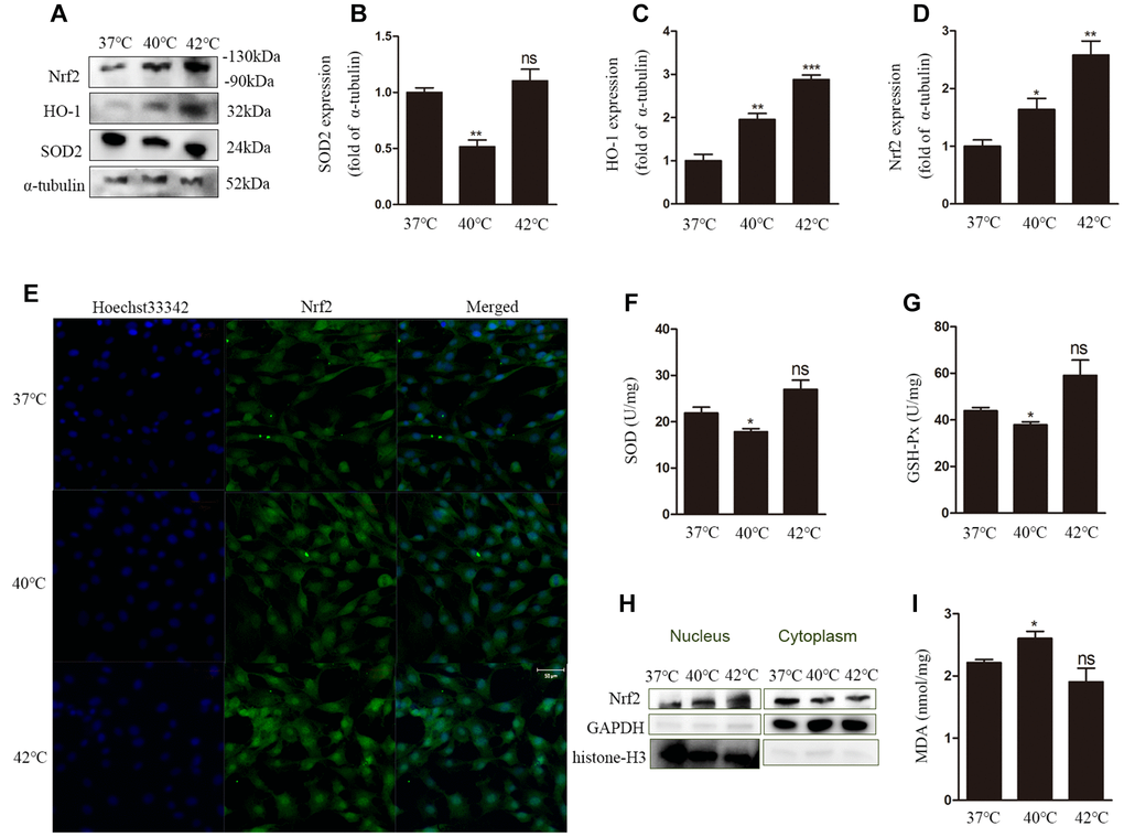 Next, the expression of nuclear factor erythroid 2-related factor 2 (Nrf2) and HO-1was measured at the protein level. The expression of both proteins was increased significantly after heat stress (Figure 2A, 2C, 2D), a condition that also promoted nuclear translocation of Nrf2 (Figure 2E, 2H).