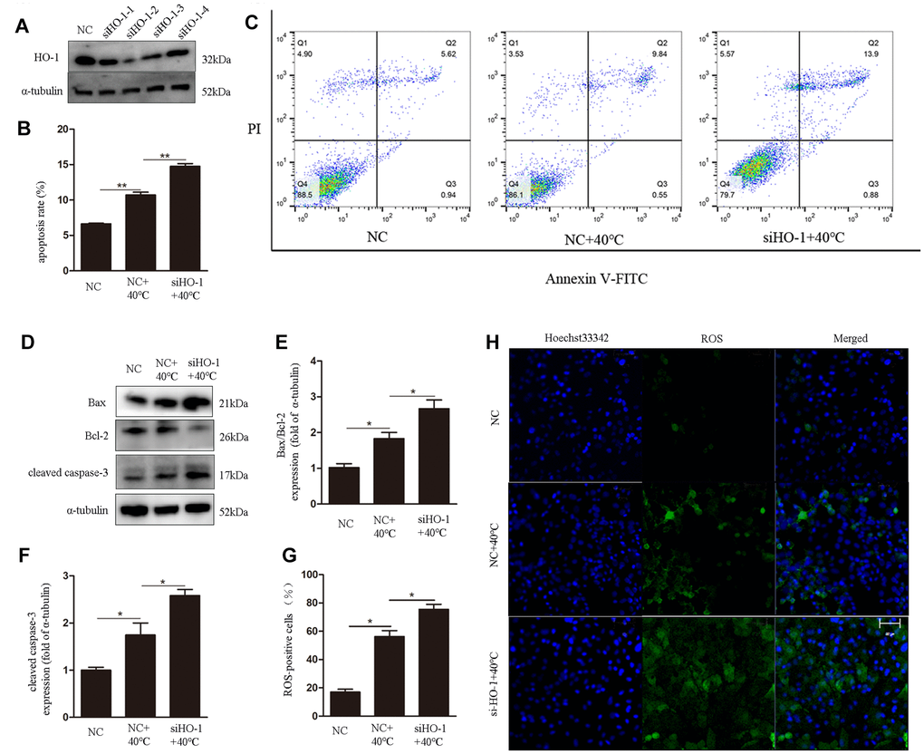 HO-1knockdown enhances heat stress-induced ROS generation and apoptosis, and reduces the antioxidative response