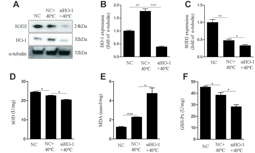 To assess the role of HO-1 on oxidative stress responses and apoptosis under heat stress, its expression was silenced using specific siRNAs. We used siHO-1-2 in these experiment because it had the strongest knockdown effect (Figure 3A). Annexin V/PI staining showed that the apoptotic rate in the siHO-1 + 40°C group of cells was increased significantly compared to the NC (negative control siRNA) + 40°C group (Figure 3B, 3C). Concomitantly, and compared to the latter control, significant increases in the expression of cleaved caspase-3 and the Bax/Bcl-2 ratio (Figure 3D–3F), as well as enhanced ROS production (Figure 3G, 3H), were observed in siHO-1 + 40°C cells. To investigate whether HO-1 silencing affects the redox status of GCs, SOD2 expression, MDA content, and SOD and GSH-Px activities were next measured. Western blot confirmed effective silencing of HO-1 expression in siHO-1-transfected GCs, and a significant decrease in SOD2 expression in the siHO-1 + 40°C group of cells (Figure 4A, 4C). This result was consistent with reduced SOD levels in HO-1-silenced, heat stress GCs (Figure 4D). In addition, compared to the NC + 40°C group, MDA levels were significantly up-regulated (Figure 4E) and the activity of GSH-Px was significantly down-regulated (Figure 4F) in the siHO-1 + 40°C group.