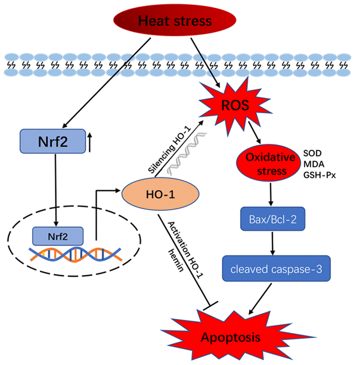 In summary, we found that heat stress induces apoptosis in bovine GCs by increasing intracellular ROS and ROS and decreasing the expression and activity of antioxidant enzymes. Under heat stress, HO-1 silencing enhances ROS production and apoptosis, while forced expression decreases apoptosis by attenuating ROS accumulation and upregulating the expression/activity of antioxidant enzymes. Thus, modulation of HO-1 expression may be a promising approach to the prevention and treatment of ovarian dysfunction and infertility caused by heat stress in cow.