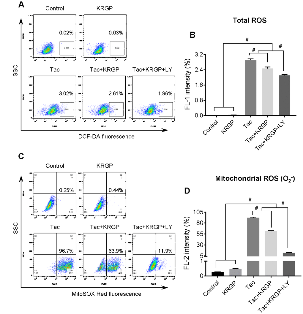 Next, we evaluated whether KRGP treatment decreases Tac-induced intracellular ROS accumulation, specifically mitochondrial superoxide (O2-), using flow cytometric analysis of HK-2 cells. KRGP co-treatment showed significantly reduced MitoSOX Red fluorescence (for detecting O2-) and DCF-DA fluorescence (for detecting total ROS); suppression of PI3K by LY294002 further reduced the expression (Figure 8).