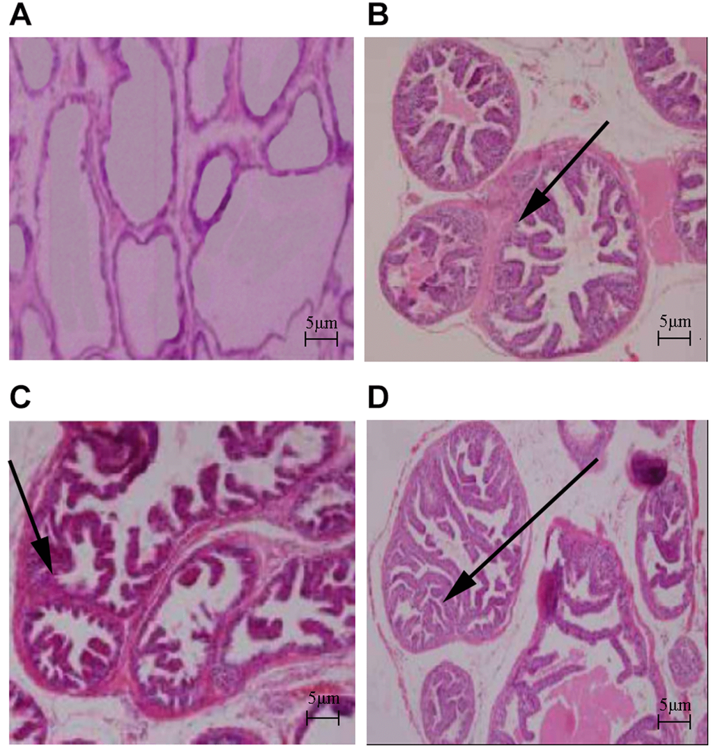 The body weights of the HFD and HFD+testosterone groups were significantly higher than the control group (p<0.01). The prostatic wet weight of the control group was lower than the other three groups (p<0.01). The same results existed with respect to the prostatic index, which was significantly increased in the three groups compared to the control group (p<0.01; Table 1). As shown in Figure 1, the results of HE staining indicated that the control group presented with acini and typical characteristics, as well as high epithelial folds in the distal region of the gland. The HFD, testosterone, and HFD+testosterone groups exhibited various morphologic alterations in the ventral prostate; specifically, some areas showed apparent epithelial hyperplasia. The massive empty lipid vacuoles and some inflammatory foci were also demonstrated in the HFD and HFD+testosterone groups.