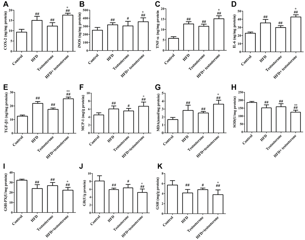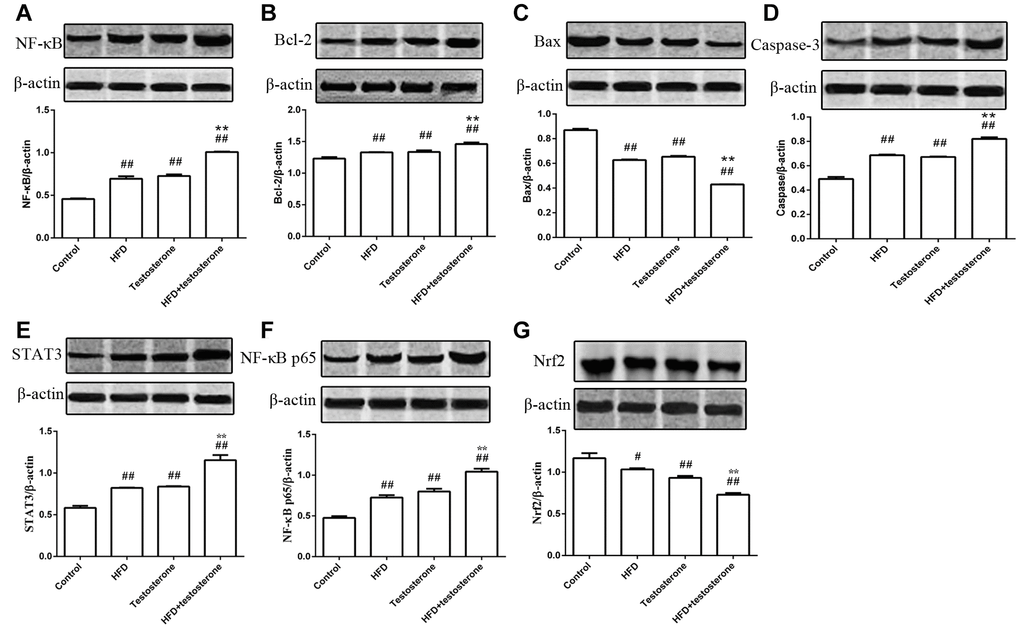 As shown in Figure 3, the expression of NF-κB, Bcl-2, and caspase-3 protein were significantly increased compared with the control group, especially in the HFD+testosterone group (p<0.01), while Bax was markedly decreased (p<0.01). The expression of STAT3 and NF-κB p65 protein was dramatically increased compared with the control group (p<0.01), while Nrf2 was significantly decreased (p<0.01 or p<0.05), especially in the HFD+testosterone group. In addition, these indicators were significantly altered in the HFD+testosterone group compared with the testosterone group (p<0.01).