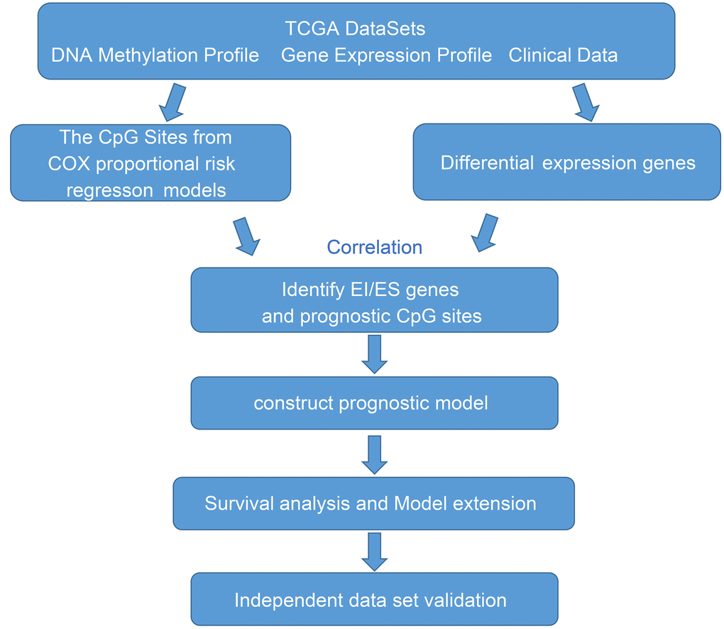 All samples were separated into two cohorts: a training set (n = 69) and a testing set (n = 69). The methylation data of training set and clinical information (survival status, time, and age) was used to select CpG sites with prognostic value by univariate and multivariate COX proportional risk regression models. Last, according to the relationship between CpG sites and genes, we obtained key genes that significantly associated with survival.