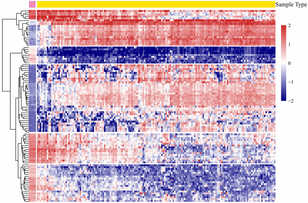 According to the screening criteria, a total of 4,881 significant DEGs were obtained from all the tumor and normal samples (Supplementary Table 5). There were 1,111 genes were upregulated and 3,770 genes downregulated. The expression profiles of the most significant 100 genes were shown in Figure 2.