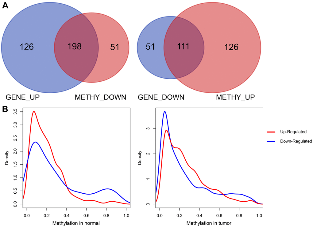 We then analyzed the Pearson correlations between upregulated DEGs and downregulated survival-methylated genes, as well as downregulated DEGs and upregulated survival-methylated genes. As shown in Figure 3A, we found that there were a total of 198 genes between upregulated DEGs and downregulated survival-methylated genes. In addition, 111 genes were selected between downregulated DEGs and upregulated survival-methylated genes. Next, we performed analysis of the promoter methylation distribution of DEGs between tumor samples and normal samples. The results showed that highly expressed genes in tumors had lower promoter methylation in normal samples, indicating a negative correlation between promoter DNA methylation and gene expression in normal and tumor tissues (Figure 3B).