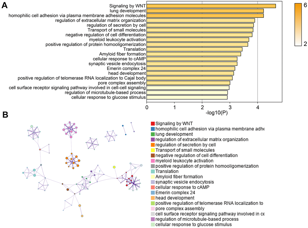 Next, we used online tools “Metascape” to performed pathway enrichment analysis. As shown in Figure 4A, we found that EI and ES genes were significantly enriched in pathways including Signaling by WNT, negative regulation of cell differentiation, regulation of extracellular matrix organization, and cellular response to cAMP. The “Metascape” also provided the interactions of genes based on these pathways (Figure 4B). These results suggested that EI and ES genes screened in our study were involved in the biological process of the occurrence and development of GBM.