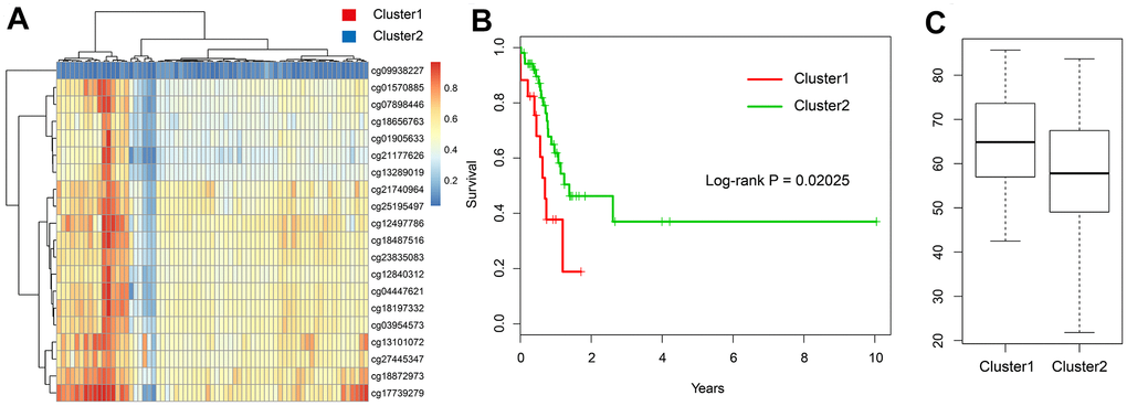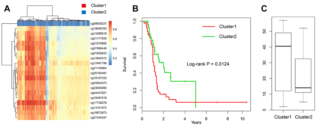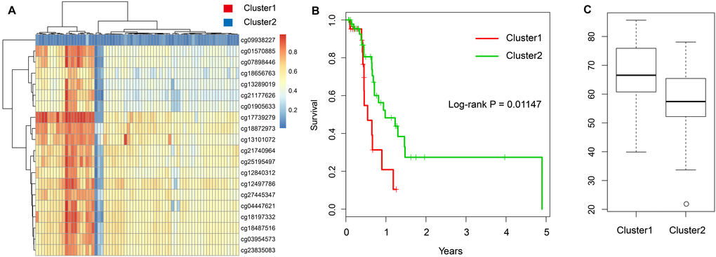 Further, we chose the 20 CpG methylation sites of above two genes (Table 1) in unsupervised clustering analysis. Using the Euclidean distance to calculate the similarity between samples, we found that all samples can be divided into two groups Cluster 1 and Cluster 2 according to the 20 CpG methylation sites. Moreover, the samples in Cluster 1 were with high methylation level, but samples in Cluster 2 were with low methylation level (Figure 5A). Further analysis was performed to explore the prognosis between two groups. As shown in Figure 5B, we found that the prognosis of the hypomethylated group was significantly better than that in the hypermethylated group (log-rank test p-value = 0.011). Moreover, we compared the ages of patients in these two groups and found that the age distribution of patients in the hypomethylated group was lower than that in the hypermethylated group (Figure 5C).
