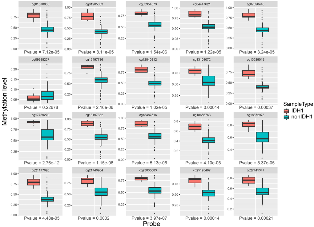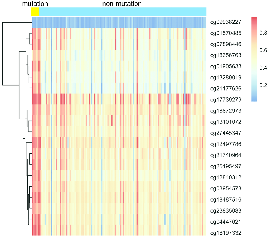 Then, we compared the expression of each methylation site in two groups. As shown in Figure 7, we found that 19 of the 20 sites were significantly expressed between IDH mutation and IDH non-mutation groups (p-value < 0.01). Above results suggested that these methylation sites were closely associated with IDH1 mutation.
