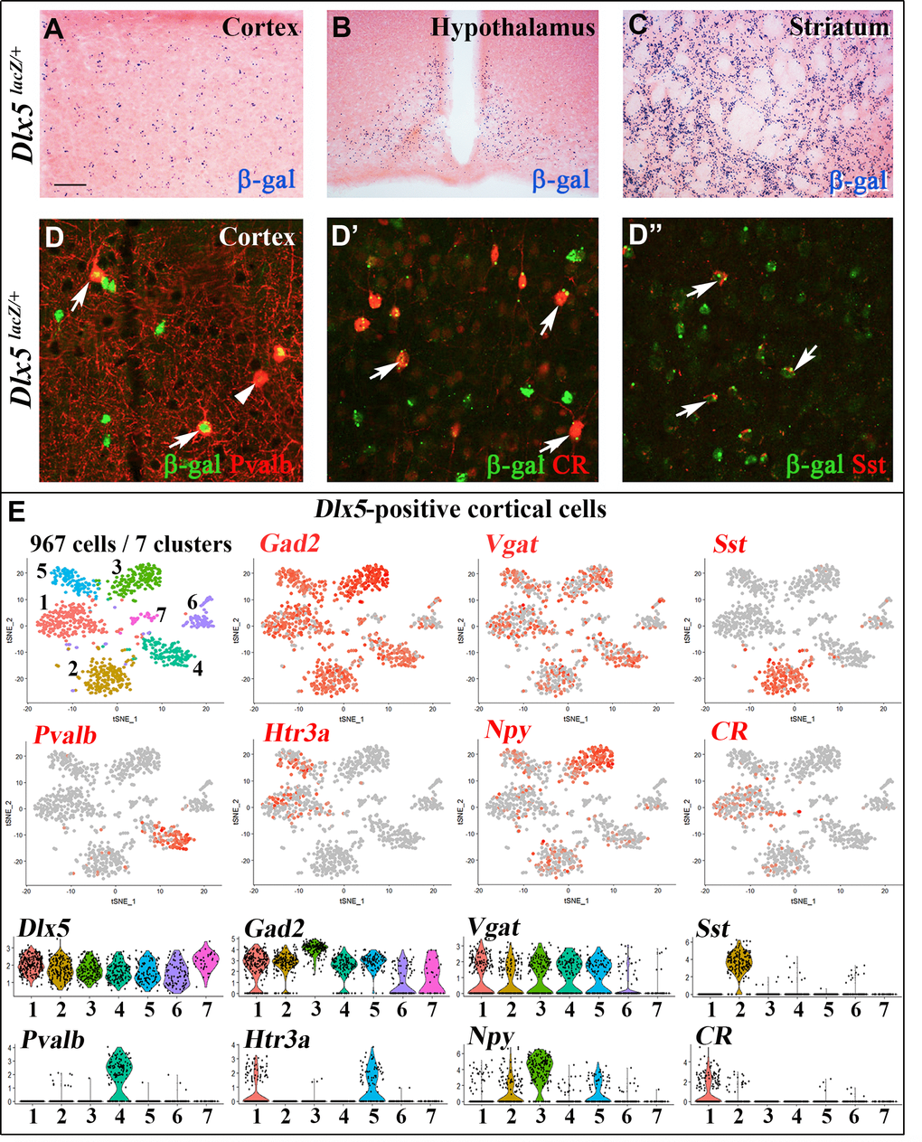 We first analyzed Dlx5lacZ/+ mice in which Dlx5 exons I and II are replaced by the E. coli lacZ gene and β-galactosidase activity reproduces the known pattern of expression of the gene in embryonic [18] and adult tissues [35]. In the central nervous system (CNS) of adult Dlx5lacZ/+ mice, β-galactosidase activity is widely detected in forebrain regions including the cerebral cortex, the striatum and the hypothalamus (Figure 1A–1C). Double immunofluorescence labelling showed that most cortical Parvalbumin (84%), Calretinin (100%) and Somatostatin (89%) interneurons are positive for Dlx5 (Figure 1D–1D”). Single cell RNA sequencing analysis (scRNA-seq) of publicly available data sets [36] showed that Dlx5 and Dlx6 expression is restricted to all subtypes of GABAergic interneurons characterized by expression of Gad1/2 and Vgat including Sst, Pvalb, HTr3a, Npy and CR clusters (Figure 1E, Supplementary Figure 1). In contrast, Dlx5/6 expression was not detected in glutamatergic neurons (Supplementary Figure 1, Vglut2) nor in mature astrocytes (Aldh1l1) and oligodendrocytes (Olig2) (Supplementary Figure 1).