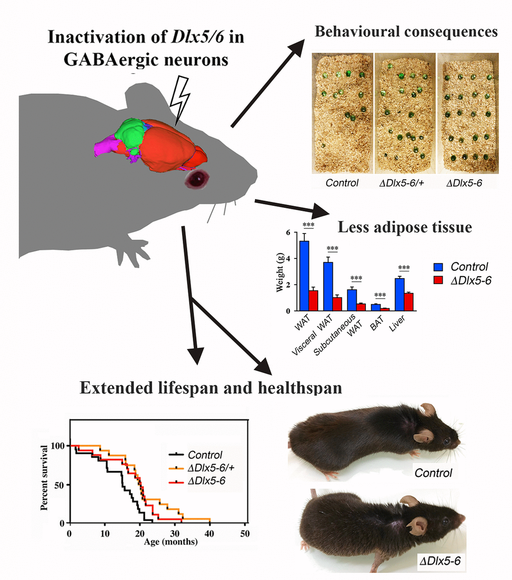 Here we analyze the phenotype of VgatΔDlx5-6 mice in which Dlx5 and Dlx6 are both inactivated only in GABAergic interneurons. Heterozygous and homozygous mutants (VgatΔDlx5-6/+ and VgatΔDlx5-6) present a reduction in anxiety-like and obsessive-compulsive-like behaviors, have less adipose tissue and live 33% longer and in better health than their control littermates. We conclude that Dlx5/6-dependent regulations in GABAergic interneurons affect behavior as well as metabolism, and contribute to determine healthspan and lifespan.