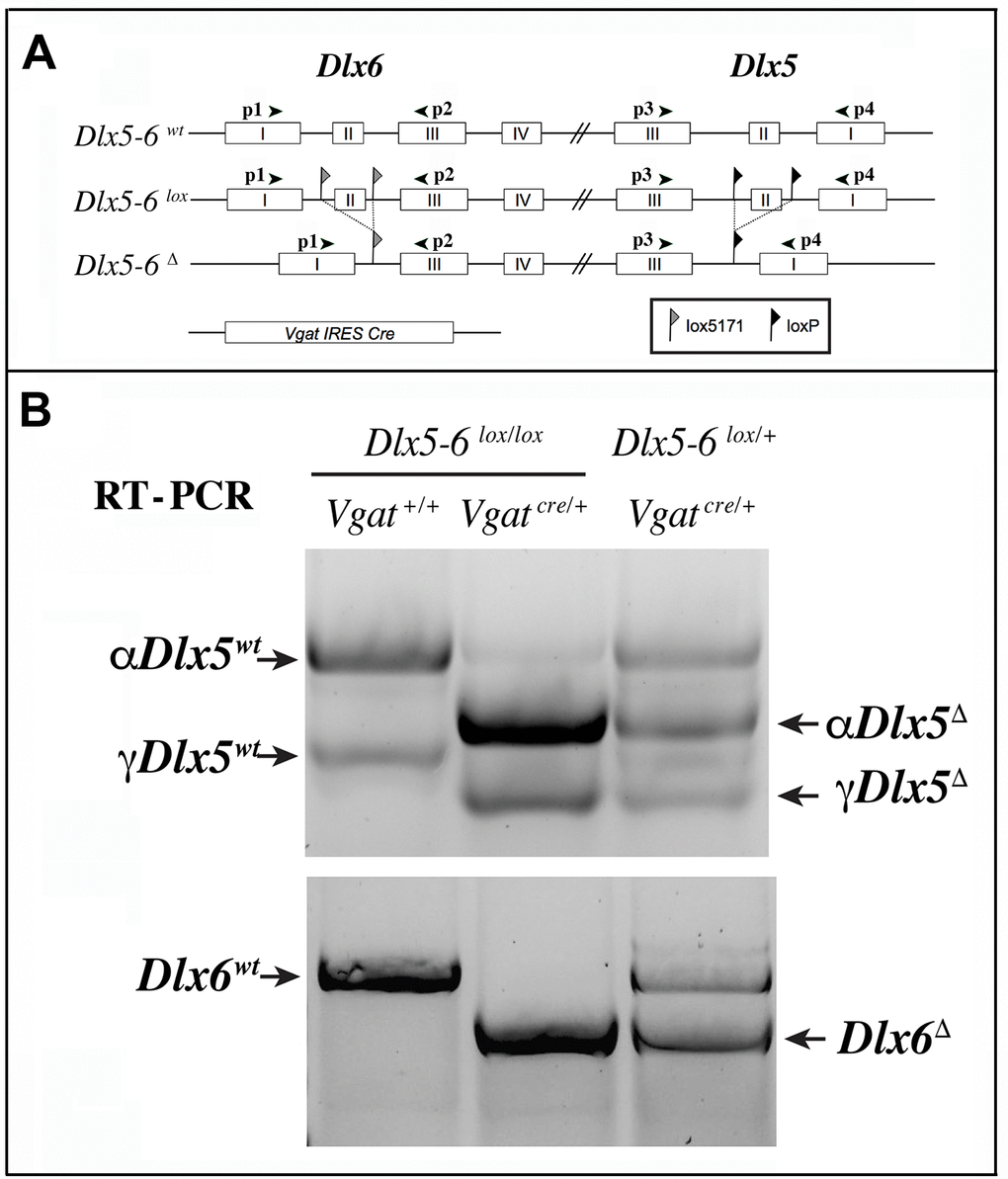 We choose to inactivate both Dlx5 and Dlx6 in GABAergic interneurons since these two closely related genes have often redundant functions [19, 20]. To inactivate Dlx5/6 genes in GABAergic interneurons we crossed Dlx5/6flox/flox mice, in which the homeodomain-encoding regions of both Dlx5 and Dlx6 are flanked by non-compatible lox sequences [35] with Vgatcre/+ mice in which an IRES-Cre recombinase cassette is inserted downstream of the stop codon of the endogenous Vgat (vesicular GABA transporter) gene. In Vgat-cre mice Cre-recombinase expression is observed in all GABAergic neurons, but not in other cell types [37]. We first generated Dlx5/6flox/+;VgatCre/+ mice (thereafter designated VgatΔDlx5-6/+) which were then crossed with Dlx5/6flox/flox mice, to obtain VgatΔDlx5-6 individuals (Dlx5/6flox/flox;VgatCre/+) (Figure 2A). VgatΔDlx5-6/+ and VgatΔDlx5-6 mice were viable and fertile. PCR analyses of cortical DNA confirmed that recombination had occurred in VgatΔDlx5-6/+ and VgatΔDlx5-6mice (Figure 2B). RT-PCR confirmed the absence of exon II in the vast majority of Dlx5 cortical transcripts (compare second and first lane of Figure 3B), and in all Dlx6 cortical transcripts of VgatΔDlx5-6mice (Figure 3A–3B).