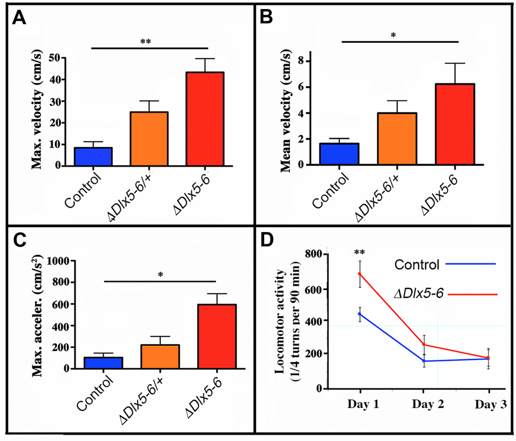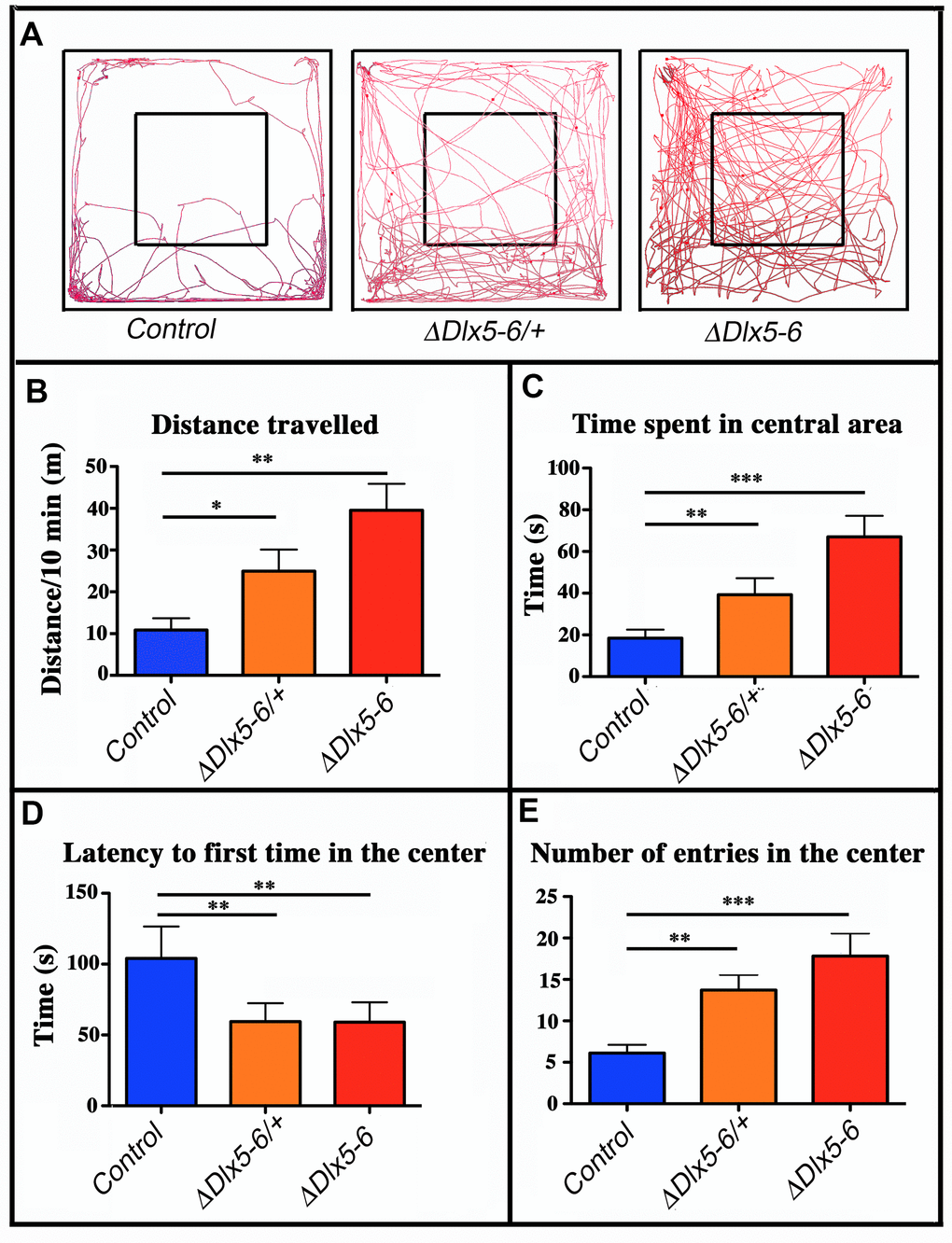 Mice were filmed while freely moving in a 72x72 cm square flat arena for 10 minutes; the path followed by the animals was tracked and analyzed (Figure 4A). VgatΔDlx5-6/+ and VgatΔDlx5-6 mice travelled respectively two or four times more the distance than their control littermates (Figure 4A, 4B).