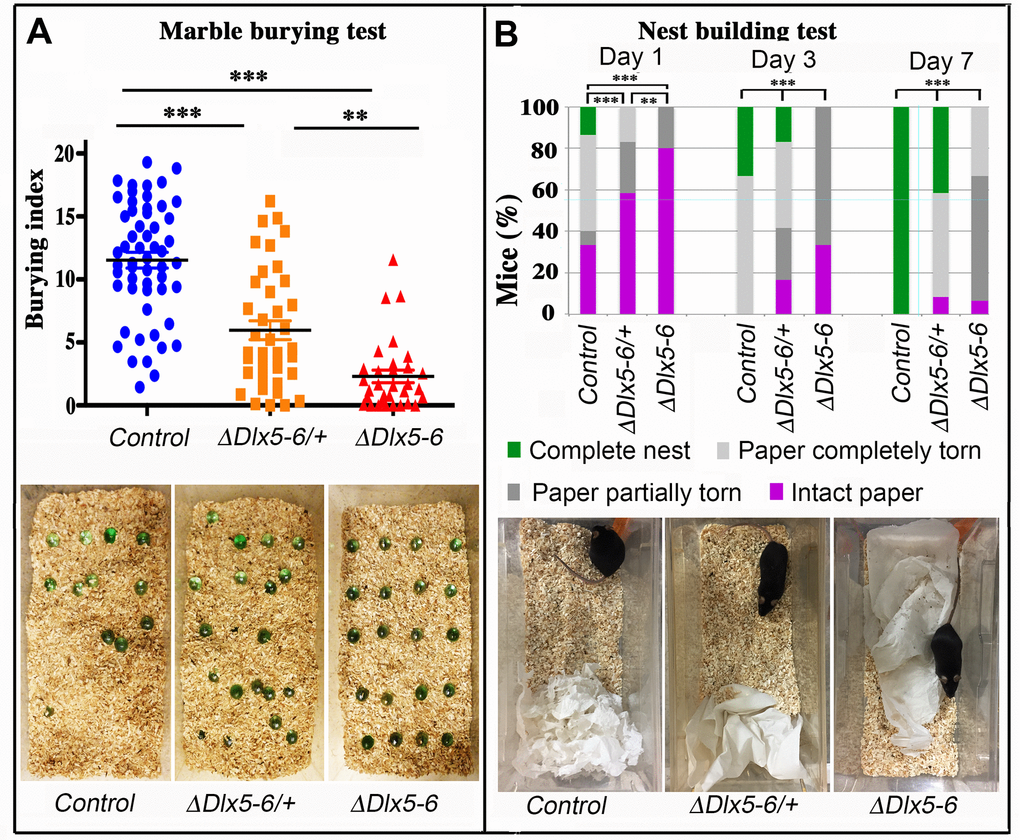 The consequences of Dlx5/6 inactivation in GABAergic neurons on stereotyped repetitive behavior were assessed through the Marble Burying Test (MBT) (Figure 6A).
