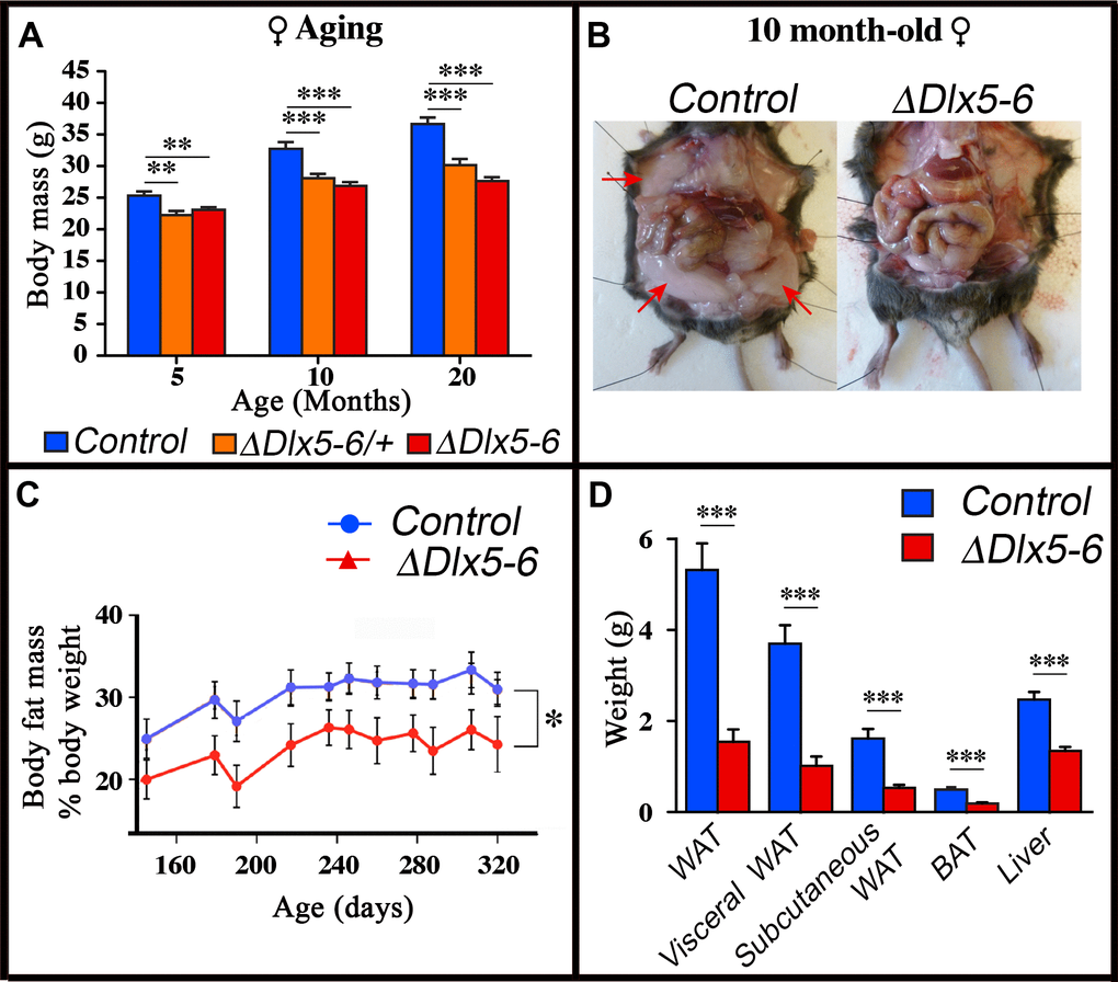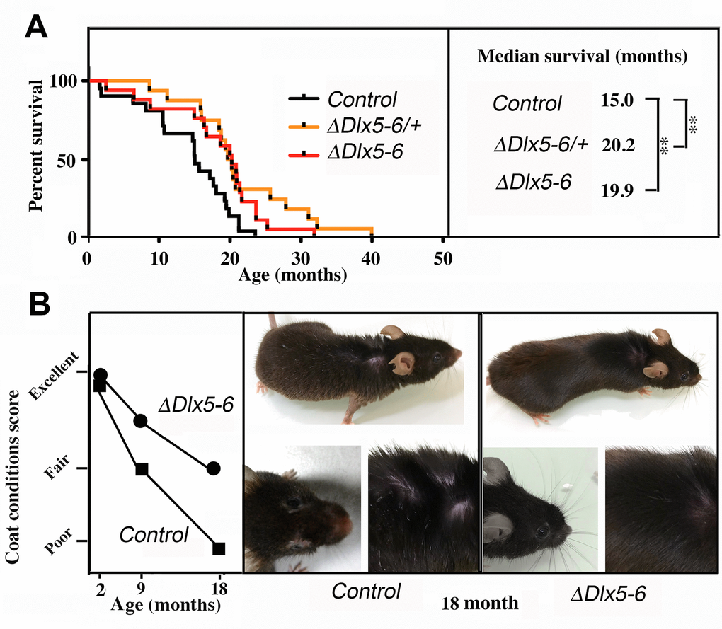 These observations, together with the high level of alertness, motility and reduced adiposity of VgatΔDlx5-6/+ and VgatΔDlx5-6 mice suggest that inactivation of Dlx5/6 in GABAergic neurons results in a prolonged and healthier lifespan.