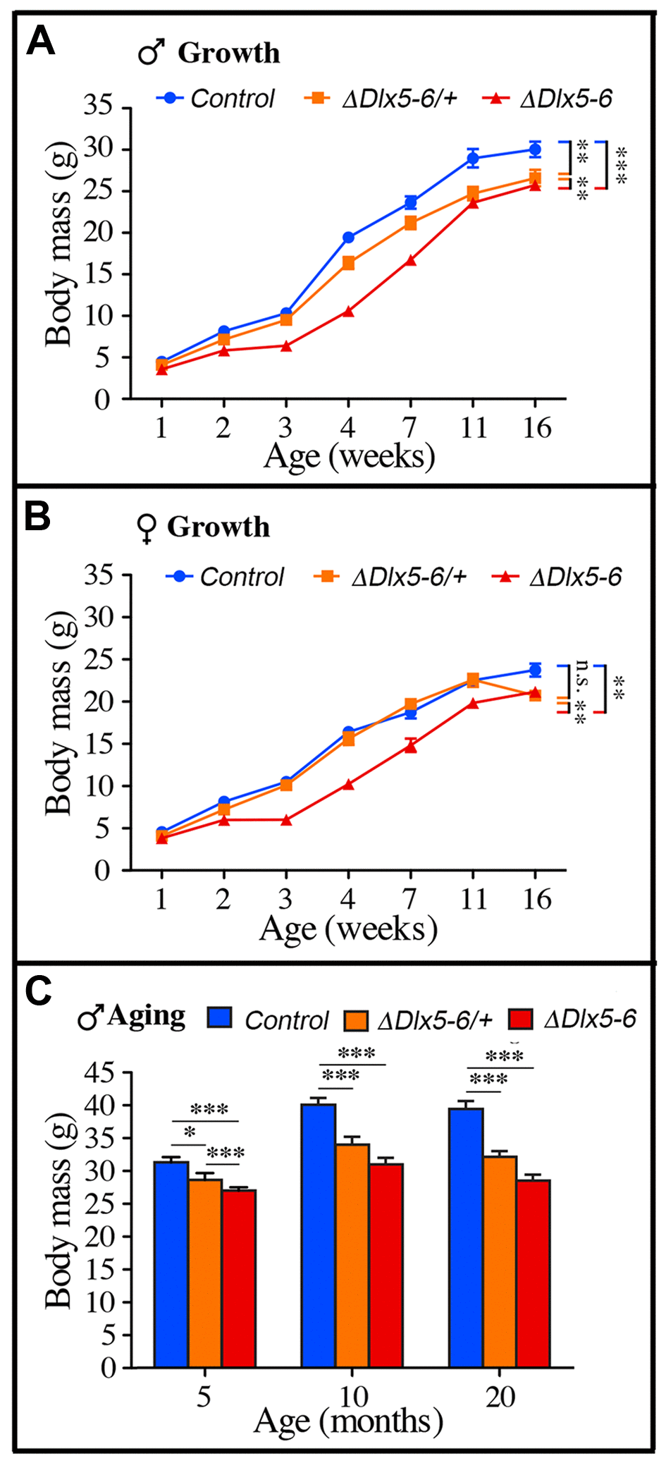 Metabolic status is one of the major determinants of healthy aging and life expectancy [42]. In turn, metabolism is controlled by the activity of neuronal networks capable to integrate hormonal signals from peripheral organs and cognitive inputs from the central nervous system [43]. Therefore, specific brain circuits can integrate sensory, cognitive and physiological inputs and affect the psychophysiological status of the body determining healthy aging trajectories. Our findings support the notion that Dlx5/6-dependent regulations in GABAergic interneurons play an important role in the central regulation of behavior and metabolism and ultimately of healthspan and lifespan.