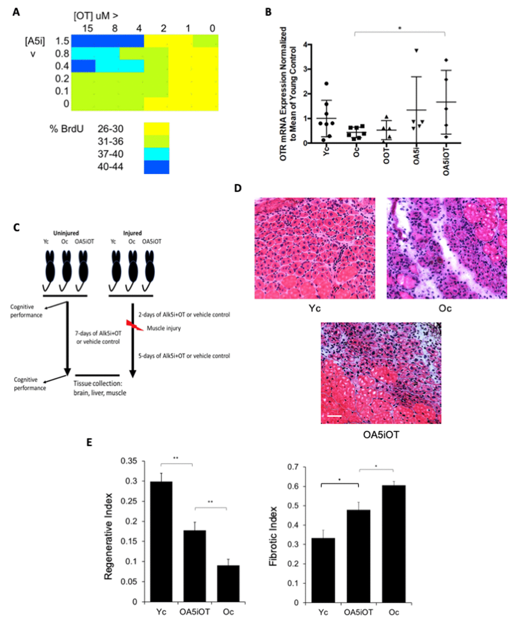 Considering these data, we designed the in vivo study depicted in Figure 1C. We selected a combination of 1/10 the previously published [14] dose of Alk5i (0.02 nmol/g-day), and OT dosed at 1 μg/g-day by subcutaneous administration into mice to provide systemic in vivo delivery of these molecules. C57.B6 male mice at 22-24 months of age (old) were injected subcutaneously and daily with Alk5i+OT or HBSS vehicle control for seven consecutive days. As a positive control for tissue health and regeneration, C57.B6 male mice at 2-3 months of age (young) were injected subcutaneously with vehicle control, HBSS. After two days of Alk5i+OT or HBSS injections, some mice from each cohort underwent experimental cardiotoxin-induced injury to their muscle (Tibialis Anterior and Gastrocnemius) and were again injected daily with Alk5i+OT or HBSS for the 5 days of recovery (e.g., 7 days total treatment); while other mice were analyzed in the absence of tissue injury. A number of assays were performed on tissues that represent each of the three developmental germ layers, and animal cognitive capacity was evaluated, as described below.