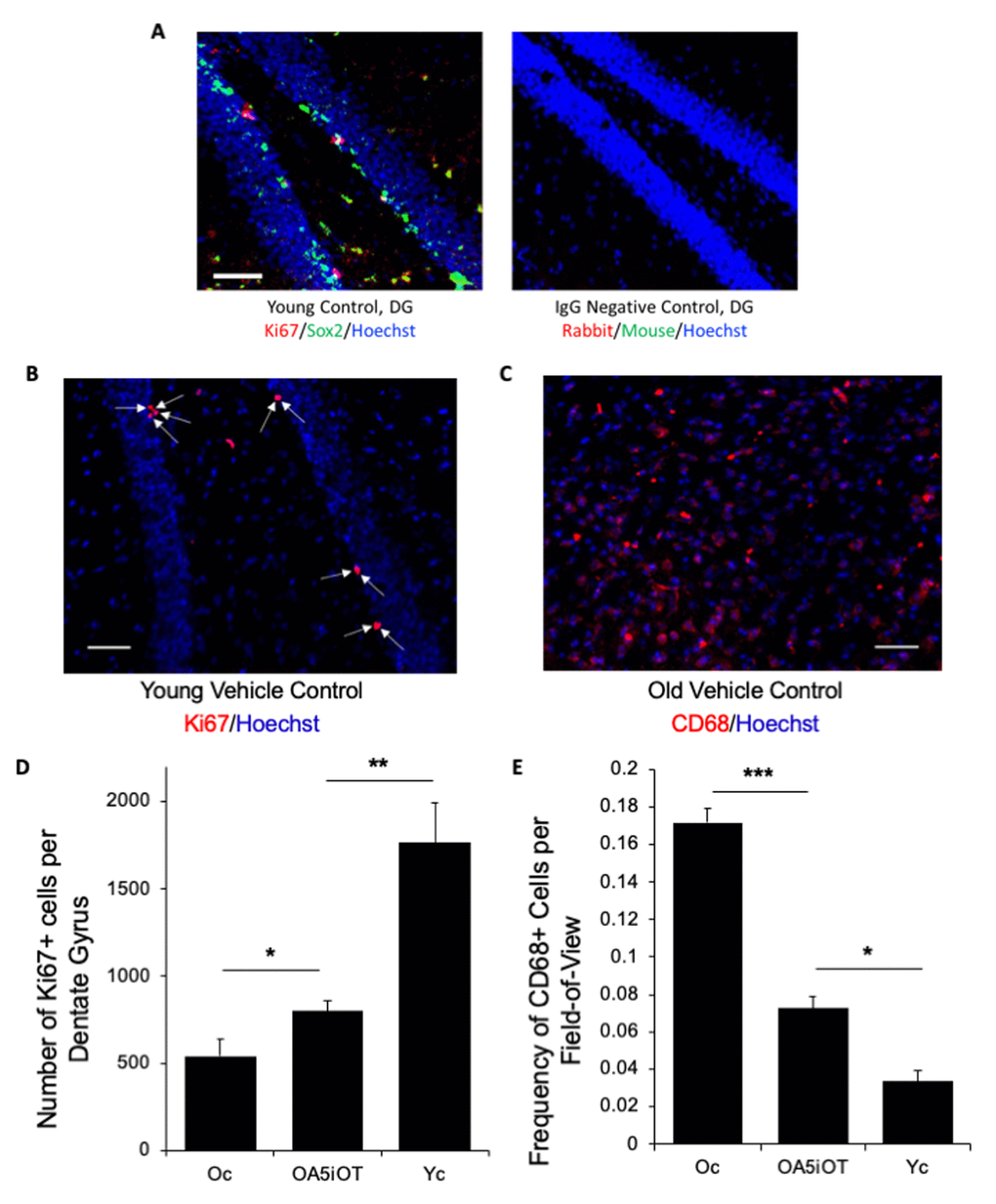 Neurogenesis in the hippocampus decreases dramatically with age [25]. In previous work, heterochronic parabiosis or dosing with high level of Alk5i were shown to enhance hippocampal neurogenesis of old mice, while heterochronic blood exchange had no positive effects on old neurogenesis and profoundly attenuated young neurogenesis [2,6,7,14]. The effects of ectopic OT have not been explicitly studied with respect to age-specific neurogenesis.
