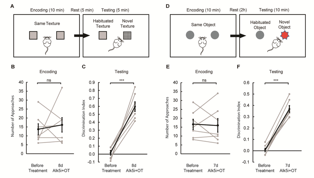 We then treated the same group of aged mice with Alk5i+OT for 7 to 8 days and re-tested them on the texture discrimination and the NOR test. We found that the treatment did not alter the overall amount of interaction with textures and objects during the encoding phase of each task (Figure 3 B, E). Remarkably however during the test phase, the treatment significantly improved the performance of each old animal in both tasks: demonstrating preferential interest to novel texture and novel object (Figure 3 C, F).